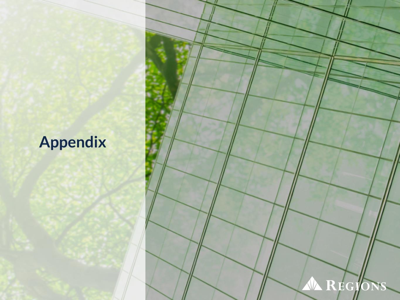 84 • Our ability to comply with stress testing and capital planning requirements (as part of the CCAR process or otherwise) may continue to require a significant investment of our managerial resources due to the importance of such tests and requirements. • Our ability to comply with applicable capital and liquidity requirements (including, among other things, the Basel III capital standards), including our ability to generate capital internally or raise capital on favorable terms, and if we fail to meet requirements, our financial condition and market perceptions of us could be negatively impacted. • Our ability to recruit and retain talented and experienced personnel to assist in the development, management and operation of our products and services may be affected by changes in laws and regulations in effect from time to time. • Our ability to receive dividends from our subsidiaries, in particular Regions Bank, could affect our liquidity and ability to pay dividends to shareholders. • Fluctuations in the price of our common stock and inability to complete stock repurchases in the time frame and/or on the terms anticipated. • The effects of anti-takeover laws and exclusive forum provision in our certificate of incorporation and bylaws. • The effect of new tax legislation and/or interpretation of existing tax law, which may impact our earnings, capital ratios and our ability to return capital to shareholders. • Changes in accounting policies or procedures as may be required by the FASB or other regulatory agencies could materially affect our financial statements and how we report those results, and expectations and preliminary analyses relating to how such changes will affect our financial results could prove incorrect. • Any impairment of our goodwill or other intangibles, any repricing of assets or any adjustment of valuation allowances on our deferred tax assets due to changes in tax law, adverse changes in the economic environment declining operations of the reporting unit or other factors. • The effects of man-made and natural disasters, including fires, floods, droughts, tornadoes, hurricanes and environmental damage (especially in the Southeastern United States), which may negatively affect our operations and/or our loan portfolios and increase our cost of conducting business. The severity and frequency of future earthquakes, fires, hurricanes, tornadoes, droughts, floods and other weather-related events are difficult to predict and may be exacerbated by global climate change. • The impact of pandemics on our businesses, operations and financial results and conditions. The duration and severity of any pandemic as well as government actions or other restrictions in connection with such events could disrupt the global economy, adversely affect our capital and liquidity position, impair the ability of borrowers to repay outstanding loans and increase our allowance for credit losses, impair collateral values and result in lost revenue or additional expenses. • The effects of any damage to our reputation resulting from developments related to any of the items identified above. • Other risks identified from time to time in reports that we file with the SEC. The foregoing list of factors is not exhaustive. For discussion of these and other factors that may cause actual results to differ from expectations, look under the captions “Forward-Looking Statements” and “Risk Factors” in Regions’ Annual Report on Form 10-K for the year ended December 31, 2023 and in Regions’ subsequent filings with the SEC. You should not place undue reliance on any forward-looking statements, which speak only as of the date made. Factors or events that could cause our actual results to differ may emerge from time to time, and it is not possible to predict all of them. We assume no obligation and do not intend to update or revise any forward-looking statements that are made from time to time, either as a result of future developments, new information or otherwise, except as may be required by law. Regions’ Investor Relations contact is Dana Nolan at (205) 264-7040; Regions’ Media contact is Jeremy King at (205) 264-4551. Forward-Looking Statements (continued)