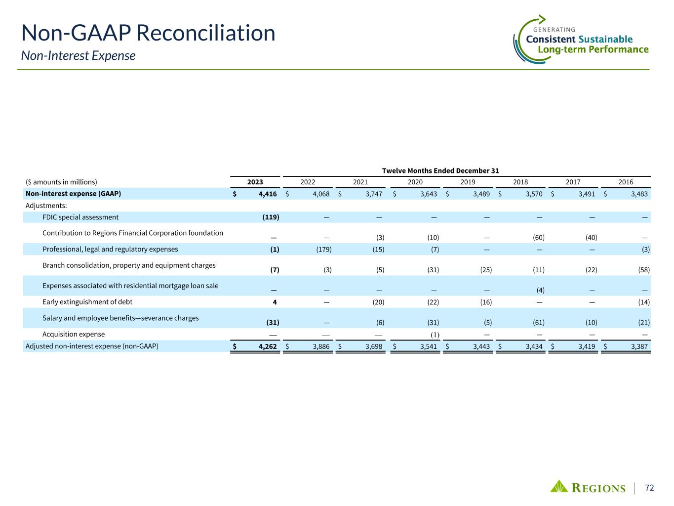 72 Non-GAAP Reconciliation Non-Interest Expense Twelve Months Ended December 31 ($ amounts in millions) 2023 2022 2021 2020 2019 2018 2017 2016 Non-interest expense (GAAP) $ 4,416 $ 4,068 $ 3,747 $ 3,643 $ 3,489 $ 3,570 $ 3,491 $ 3,483 Adjustments: FDIC special assessment (119) — — — — — — — Contribution to Regions Financial Corporation foundation — — (3) (10) — (60) (40) — Professional, legal and regulatory expenses (1) (179) (15) (7) — — — (3) Branch consolidation, property and equipment charges (7) (3) (5) (31) (25) (11) (22) (58) Expenses associated with residential mortgage loan sale — — — — — (4) — — Early extinguishment of debt 4 — (20) (22) (16) — — (14) Salary and employee benefits—severance charges (31) — (6) (31) (5) (61) (10) (21) Acquisition expense — — — (1) — — — — Adjusted non-interest expense (non-GAAP) $ 4,262 $ 3,886 $ 3,698 $ 3,541 $ 3,443 $ 3,434 $ 3,419 $ 3,387