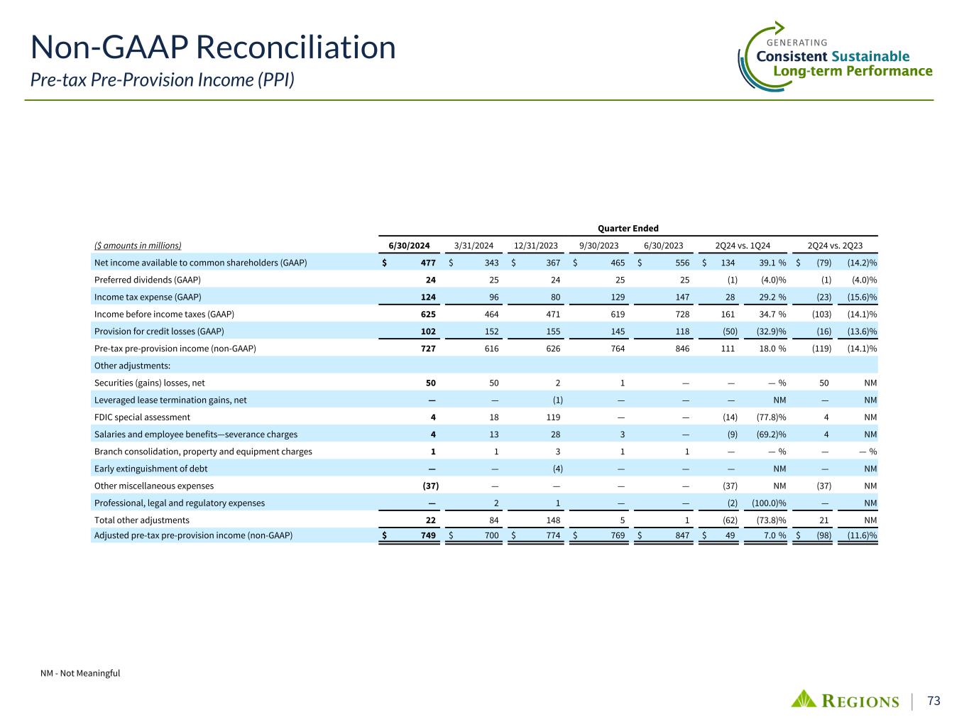 73 Non-GAAP Reconciliation Pre-tax Pre-Provision Income (PPI) Quarter Ended ($ amounts in millions) 6/30/2024 3/31/2024 12/31/2023 9/30/2023 6/30/2023 2Q24 vs. 1Q24 2Q24 vs. 2Q23 Net income available to common shareholders (GAAP) $ 477 $ 343 $ 367 $ 465 $ 556 $ 134 39.1 % $ (79) (14.2) % Preferred dividends (GAAP) 24 25 24 25 25 (1) (4.0) % (1) (4.0) % Income tax expense (GAAP) 124 96 80 129 147 28 29.2 % (23) (15.6) % Income before income taxes (GAAP) 625 464 471 619 728 161 34.7 % (103) (14.1) % Provision for credit losses (GAAP) 102 152 155 145 118 (50) (32.9) % (16) (13.6) % Pre-tax pre-provision income (non-GAAP) 727 616 626 764 846 111 18.0 % (119) (14.1) % Other adjustments: Securities (gains) losses, net 50 50 2 1 — — — % 50 NM Leveraged lease termination gains, net — — (1) — — — NM — NM FDIC special assessment 4 18 119 — — (14) (77.8) % 4 NM Salaries and employee benefits—severance charges 4 13 28 3 — (9) (69.2) % 4 NM Branch consolidation, property and equipment charges 1 1 3 1 1 — — % — — % Early extinguishment of debt — — (4) — — — NM — NM Other miscellaneous expenses (37) — — — — (37) NM (37) NM Professional, legal and regulatory expenses — 2 1 — — (2) (100.0) % — NM Total other adjustments 22 84 148 5 1 (62) (73.8) % 21 NM Adjusted pre-tax pre-provision income (non-GAAP) $ 749 $ 700 $ 774 $ 769 $ 847 $ 49 7.0 % $ (98) (11.6) % NM - Not Meaningful