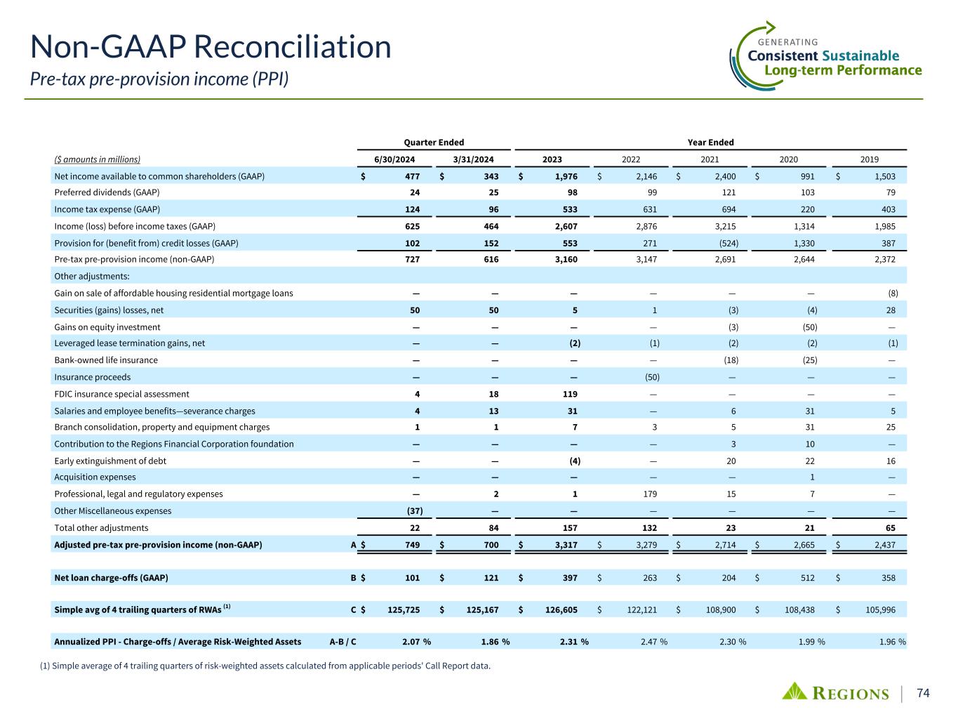 74 Quarter Ended Year Ended ($ amounts in millions) 6/30/2024 3/31/2024 2023 2022 2021 2020 2019 Net income available to common shareholders (GAAP) $ 477 $ 343 $ 1,976 $ 2,146 $ 2,400 $ 991 $ 1,503 Preferred dividends (GAAP) 24 25 98 99 121 103 79 Income tax expense (GAAP) 124 96 533 631 694 220 403 Income (loss) before income taxes (GAAP) 625 464 2,607 2,876 3,215 1,314 1,985 Provision for (benefit from) credit losses (GAAP) 102 152 553 271 (524) 1,330 387 Pre-tax pre-provision income (non-GAAP) 727 616 3,160 3,147 2,691 2,644 2,372 Other adjustments: Gain on sale of affordable housing residential mortgage loans — — — — — — (8) Securities (gains) losses, net 50 50 5 1 (3) (4) 28 Gains on equity investment — — — — (3) (50) — Leveraged lease termination gains, net — — (2) (1) (2) (2) (1) Bank-owned life insurance — — — — (18) (25) — Insurance proceeds — — — (50) — — — FDIC insurance special assessment 4 18 119 — — — — Salaries and employee benefits—severance charges 4 13 31 — 6 31 5 Branch consolidation, property and equipment charges 1 1 7 3 5 31 25 Contribution to the Regions Financial Corporation foundation — — — — 3 10 — Early extinguishment of debt — — (4) — 20 22 16 Acquisition expenses — — — — — 1 — Professional, legal and regulatory expenses — 2 1 179 15 7 — Other Miscellaneous expenses (37) — — — — — — Total other adjustments 22 84 157 132 23 21 65 Adjusted pre-tax pre-provision income (non-GAAP) A $ 749 $ 700 $ 3,317 $ 3,279 $ 2,714 $ 2,665 $ 2,437 Net loan charge-offs (GAAP) B $ 101 $ 121 $ 397 $ 263 $ 204 $ 512 $ 358 Simple avg of 4 trailing quarters of RWAs (1) C $ 125,725 $ 125,167 $ 126,605 $ 122,121 $ 108,900 $ 108,438 $ 105,996 Annualized PPI - Charge-offs / Average Risk-Weighted Assets A-B / C 2.07 % 1.86 % 2.31 % 2.47 % 2.30 % 1.99 % 1.96 % (1) Simple average of 4 trailing quarters of risk-weighted assets calculated from applicable periods' Call Report data. Non-GAAP Reconciliation Pre-tax pre-provision income (PPI)