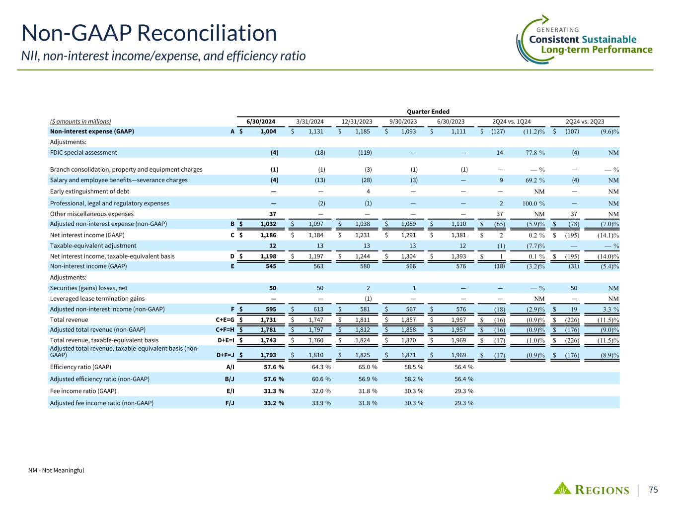 75 Non-GAAP Reconciliation NII, non-interest income/expense, and efficiency ratio NM - Not Meaningful Quarter Ended ($ amounts in millions) 6/30/2024 3/31/2024 12/31/2023 9/30/2023 6/30/2023 2Q24 vs. 1Q24 2Q24 vs. 2Q23 Non-interest expense (GAAP) A $ 1,004 $ 1,131 $ 1,185 $ 1,093 $ 1,111 $ (127) (11.2) % $ (107) (9.6) % Adjustments: FDIC special assessment (4) (18) (119) — — 14 77.8 % (4) NM Branch consolidation, property and equipment charges (1) (1) (3) (1) (1) — — % — — % Salary and employee benefits—severance charges (4) (13) (28) (3) — 9 69.2 % (4) NM Early extinguishment of debt — — 4 — — — NM — NM Professional, legal and regulatory expenses — (2) (1) — — 2 100.0 % — NM Other miscellaneous expenses 37 — — — — 37 NM 37 NM Adjusted non-interest expense (non-GAAP) B $ 1,032 $ 1,097 $ 1,038 $ 1,089 $ 1,110 $ (65) (5.9) % $ (78) (7.0) % Net interest income (GAAP) C $ 1,186 $ 1,184 $ 1,231 $ 1,291 $ 1,381 $ 2 0.2 % $ (195) (14.1) % Taxable-equivalent adjustment 12 13 13 13 12 (1) (7.7) % — — % Net interest income, taxable-equivalent basis D $ 1,198 $ 1,197 $ 1,244 $ 1,304 $ 1,393 $ 1 0.1 % $ (195) (14.0) % Non-interest income (GAAP) E 545 563 580 566 576 (18) (3.2) % (31) (5.4) % Adjustments: Securities (gains) losses, net 50 50 2 1 — — — % 50 NM Leveraged lease termination gains — — (1) — — — NM — NM Adjusted non-interest income (non-GAAP) F $ 595 $ 613 $ 581 $ 567 $ 576 (18) (2.9) % $ 19 3.3 % Total revenue C+E=G $ 1,731 $ 1,747 $ 1,811 $ 1,857 $ 1,957 $ (16) (0.9) % $ (226) (11.5) % Adjusted total revenue (non-GAAP) C+F=H $ 1,781 $ 1,797 $ 1,812 $ 1,858 $ 1,957 $ (16) (0.9) % $ (176) (9.0) % Total revenue, taxable-equivalent basis D+E=I $ 1,743 $ 1,760 $ 1,824 $ 1,870 $ 1,969 $ (17) (1.0) % $ (226) (11.5) % Adjusted total revenue, taxable-equivalent basis (non- GAAP) D+F=J $ 1,793 $ 1,810 $ 1,825 $ 1,871 $ 1,969 $ (17) (0.9) % $ (176) (8.9) % Efficiency ratio (GAAP) A/I 57.6 % 64.3 % 65.0 % 58.5 % 56.4 % Adjusted efficiency ratio (non-GAAP) B/J 57.6 % 60.6 % 56.9 % 58.2 % 56.4 % Fee income ratio (GAAP) E/I 31.3 % 32.0 % 31.8 % 30.3 % 29.3 % Adjusted fee income ratio (non-GAAP) F/J 33.2 % 33.9 % 31.8 % 30.3 % 29.3 %
