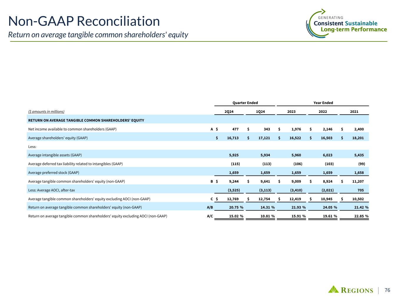 76 Quarter Ended Year Ended ($ amounts in millions) 2Q24 1Q24 2023 2022 2021 RETURN ON AVERAGE TANGIBLE COMMON SHAREHOLDERS' EQUITY Net income available to common shareholders (GAAP) A $ 477 $ 343 $ 1,976 $ 2,146 $ 2,400 Average shareholders' equity (GAAP) $ 16,713 $ 17,121 $ 16,522 $ 16,503 $ 18,201 Less: Average intangible assets (GAAP) 5,925 5,934 5,960 6,023 5,435 Average deferred tax liability related to intangibles (GAAP) (115) (113) (106) (103) (99) Average preferred stock (GAAP) 1,659 1,659 1,659 1,659 1,658 Average tangible common shareholders' equity (non-GAAP) B $ 9,244 $ 9,641 $ 9,009 $ 8,924 $ 11,207 Less: Average AOCI, after-tax (3,525) (3,113) (3,410) (2,021) 705 Average tangible common shareholders' equity excluding AOCI (non-GAAP) C $ 12,769 $ 12,754 $ 12,419 $ 10,945 $ 10,502 Return on average tangible common shareholders' equity (non-GAAP) A/B 20.75 % 14.31 % 21.93 % 24.05 % 21.42 % Return on average tangible common shareholders' equity excluding AOCI (non-GAAP) A/C 15.02 % 10.81 % 15.91 % 19.61 % 22.85 % Non-GAAP Reconciliation Return on average tangible common shareholders' equity