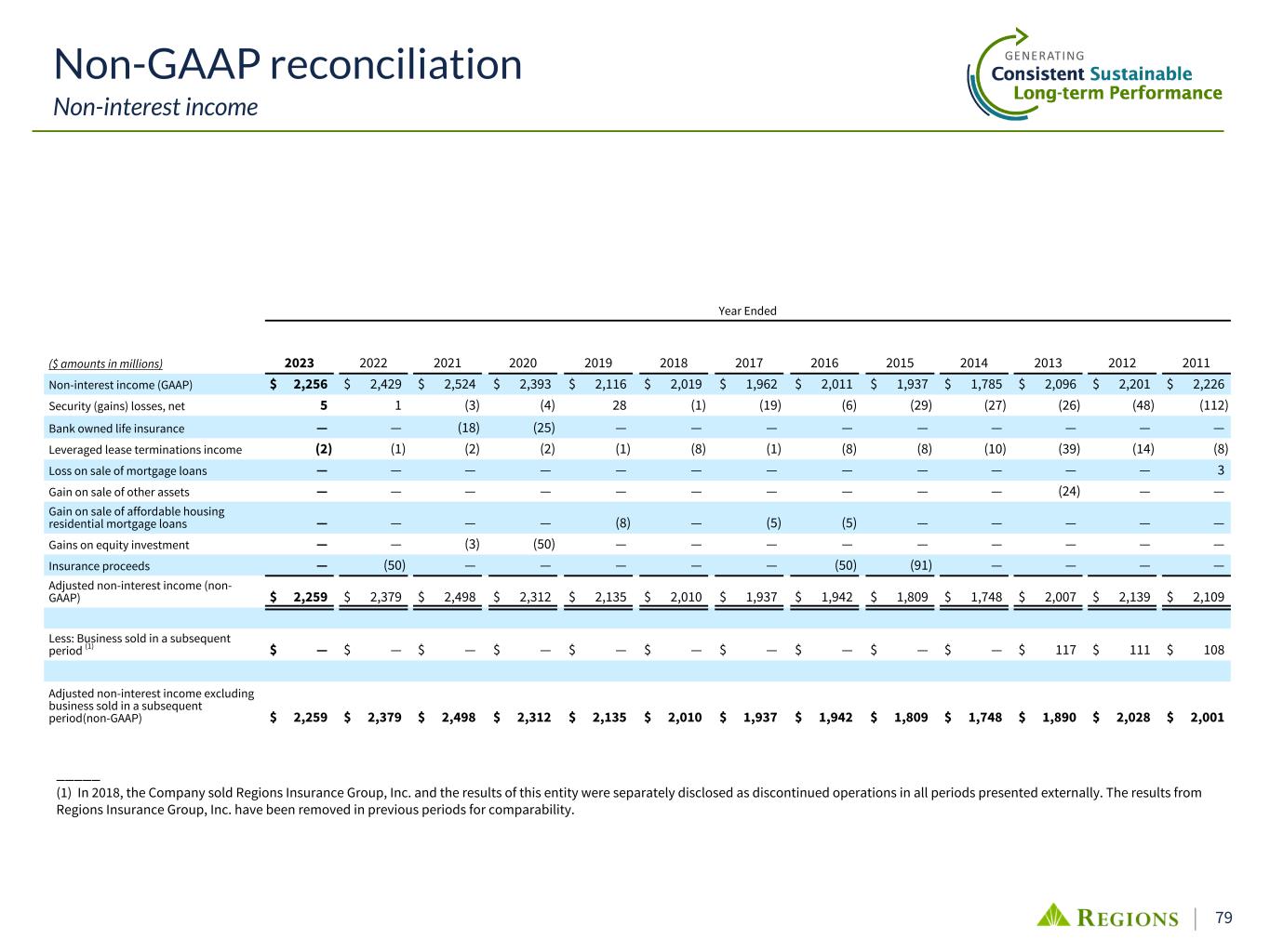 79 Non-GAAP reconciliation Non-interest income Year Ended ($ amounts in millions) 2023 2022 2021 2020 2019 2018 2017 2016 2015 2014 2013 2012 2011 Non-interest income (GAAP) $ 2,256 $ 2,429 $ 2,524 $ 2,393 $ 2,116 $ 2,019 $ 1,962 $ 2,011 $ 1,937 $ 1,785 $ 2,096 $ 2,201 $ 2,226 Security (gains) losses, net 5 1 (3) (4) 28 (1) (19) (6) (29) (27) (26) (48) (112) Bank owned life insurance — — (18) (25) — — — — — — — — — Leveraged lease terminations income (2) (1) (2) (2) (1) (8) (1) (8) (8) (10) (39) (14) (8) Loss on sale of mortgage loans — — — — — — — — — — — — 3 Gain on sale of other assets — — — — — — — — — — (24) — — Gain on sale of affordable housing residential mortgage loans — — — — (8) — (5) (5) — — — — — Gains on equity investment — — (3) (50) — — — — — — — — — Insurance proceeds — (50) — — — — — (50) (91) — — — — Adjusted non-interest income (non- GAAP) $ 2,259 $ 2,379 $ 2,498 $ 2,312 $ 2,135 $ 2,010 $ 1,937 $ 1,942 $ 1,809 $ 1,748 $ 2,007 $ 2,139 $ 2,109 Less: Business sold in a subsequent period (1) $ — $ — $ — $ — $ — $ — $ — $ — $ — $ — $ 117 $ 111 $ 108 Adjusted non-interest income excluding business sold in a subsequent period(non-GAAP) $ 2,259 $ 2,379 $ 2,498 $ 2,312 $ 2,135 $ 2,010 $ 1,937 $ 1,942 $ 1,809 $ 1,748 $ 1,890 $ 2,028 $ 2,001 _____ (1) In 2018, the Company sold Regions Insurance Group, Inc. and the results of this entity were separately disclosed as discontinued operations in all periods presented externally. The results from Regions Insurance Group, Inc. have been removed in previous periods for comparability.
