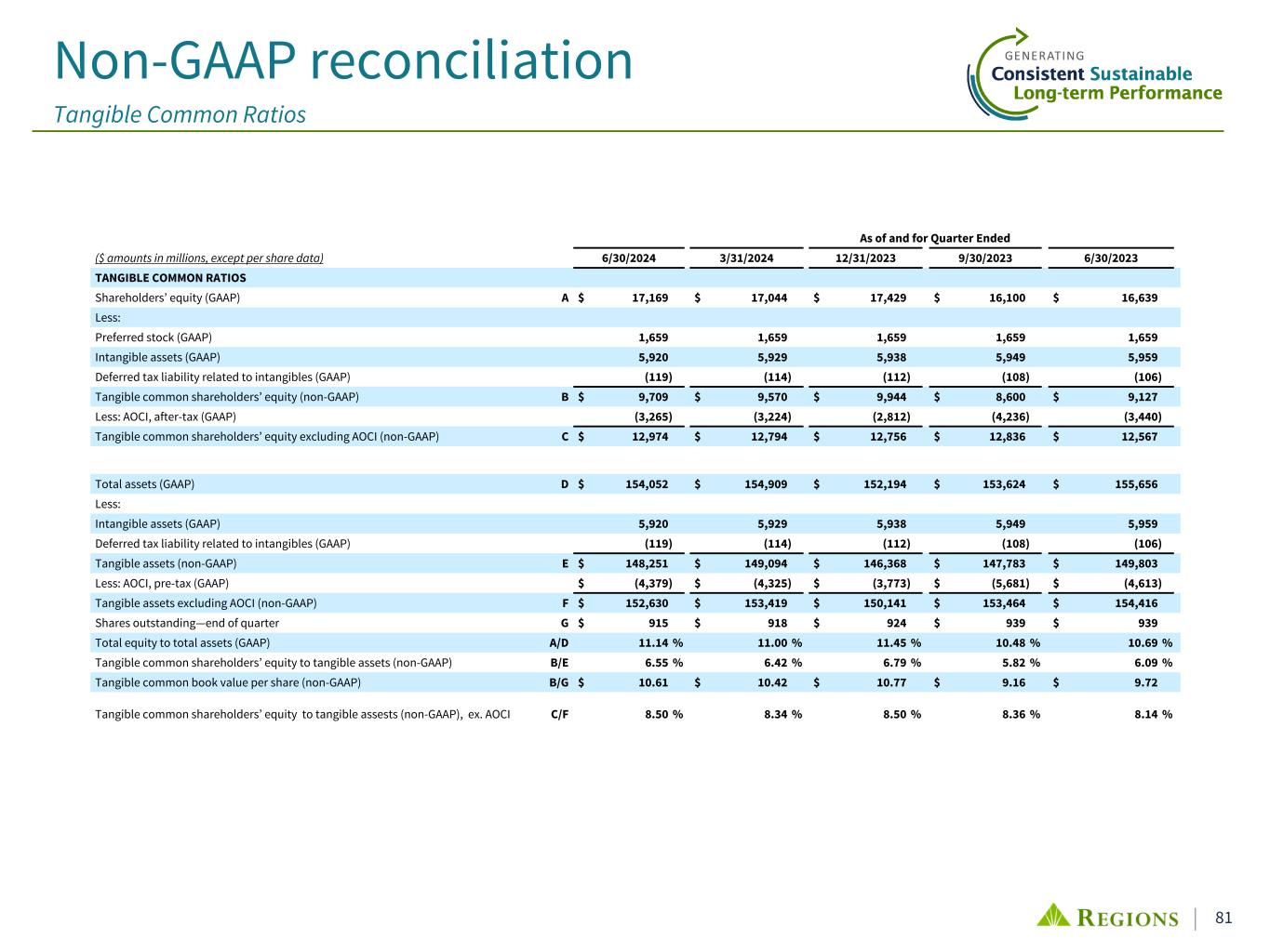 80 As of and for Quarter Ended ($ amounts in millions, except per share data) 6/30/2024 3/31/2024 12/31/2023 9/30/2023 6/30/2023 TANGIBLE COMMON RATIOS Shareholders’ equity (GAAP) A $ 17,169 $ 17,044 $ 17,429 $ 16,100 $ 16,639 Less: Preferred stock (GAAP) 1,659 1,659 1,659 1,659 1,659 Intangible assets (GAAP) 5,920 5,929 5,938 5,949 5,959 Deferred tax liability related to intangibles (GAAP) (119) (114) (112) (108) (106) Tangible common shareholders’ equity (non-GAAP) B $ 9,709 $ 9,570 $ 9,944 $ 8,600 $ 9,127 Total assets (GAAP) C $ 154,052 $ 154,909 $ 152,194 $ 153,624 $ 155,656 Less: Intangible assets (GAAP) 5,920 5,929 5,938 5,949 5,959 Deferred tax liability related to intangibles (GAAP) (119) (114) (112) (108) (106) Tangible assets (non-GAAP) D $ 148,251 $ 149,094 $ 146,368 $ 147,783 $ 149,803 Shares outstanding—end of quarter E 915 918 924 939 939 Total equity to total assets (GAAP) A/C 11.14 % 11.00 % 11.45 % 10.48 % 10.69 % Tangible common shareholders’ equity to tangible assets (non-GAAP) B/D 6.55 % 6.42 % 6.79 % 5.82 % 6.09 % Tangible common book value per share (non-GAAP) B/E $ 10.61 $ 10.42 $ 10.77 $ 9.16 $ 9.72 Non-GAAP Reconciliation Tangible Common Ratios