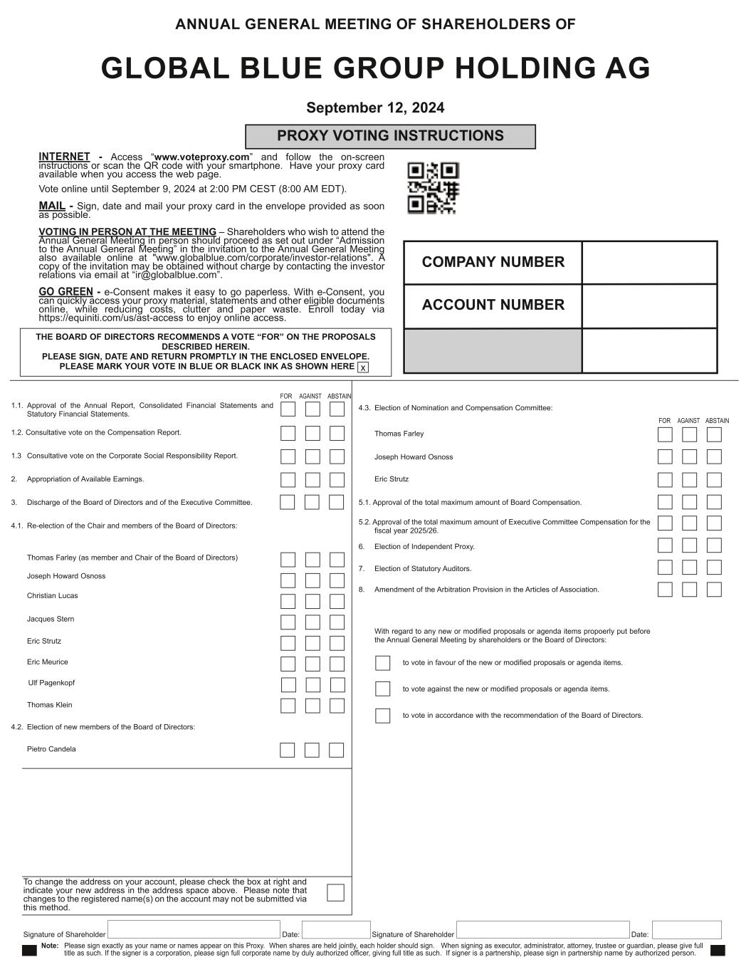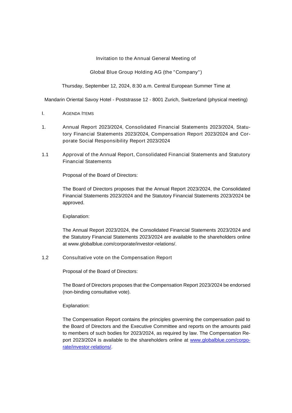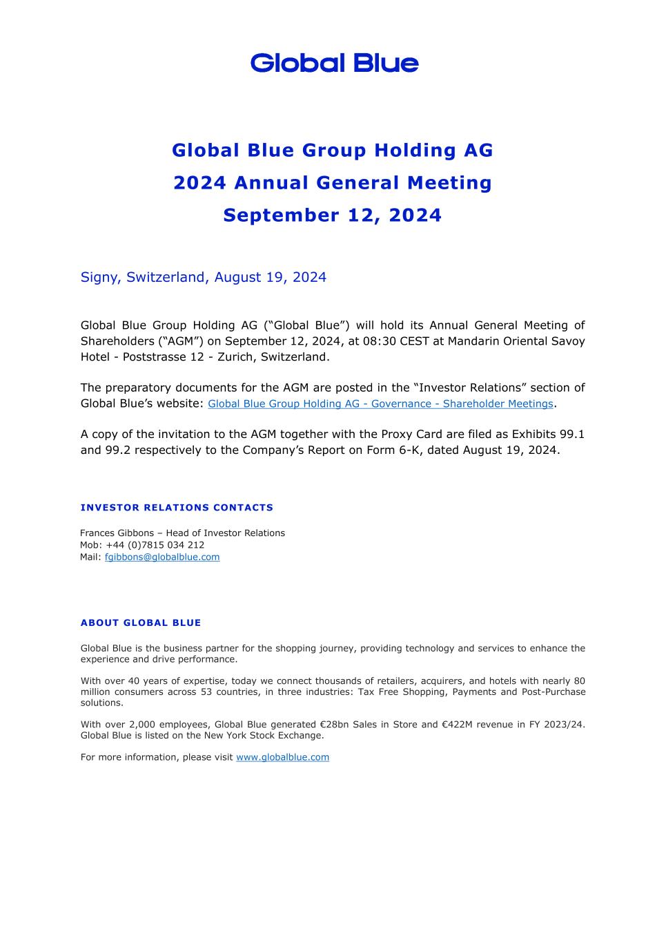 On August 19, 2024, Global Blue Group Holding AG (the “Company”) provided to its shareholders an invitation to the Company’s annual general meeting. The annual general meeting is expected to take place on Thursday, September 12, 2024 at 08:30 CEST at the Mandarin Oriental Savoy Hotel at Poststrasse 12, 8001 Zurich, Switzerland.