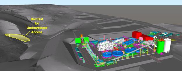 Figure 1: 3D model of the Kabanga Concentrator showing the grinding and flotation circuits and settling tanks. Phase 1 shown in color and Phase 2 in white. The box cut for the underground access portal is shown with terraces into the hillside on the left.