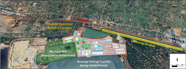 Figure 2: Satellite map with the 3D Model of the Hydromet refinery superimposed, located at the site of Barrick Gold’s past-producing Buzwagi gold mine, near Kahama, Tanzania. Phase 1 shown in color and Phase 2 in white.