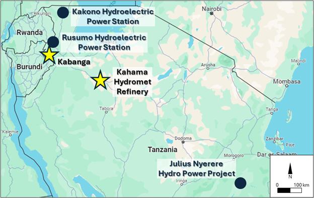 Figure 6: Map showing the locations of the Julius Nyerere Hydro Power Project (2.4 gigawatts; Turbine #7 recently commissioned), Rusumo Hydroelectric Power Station (80 megawatts) and Kakono Hydroelectric Power Station (88 megawatts; expected 2028).