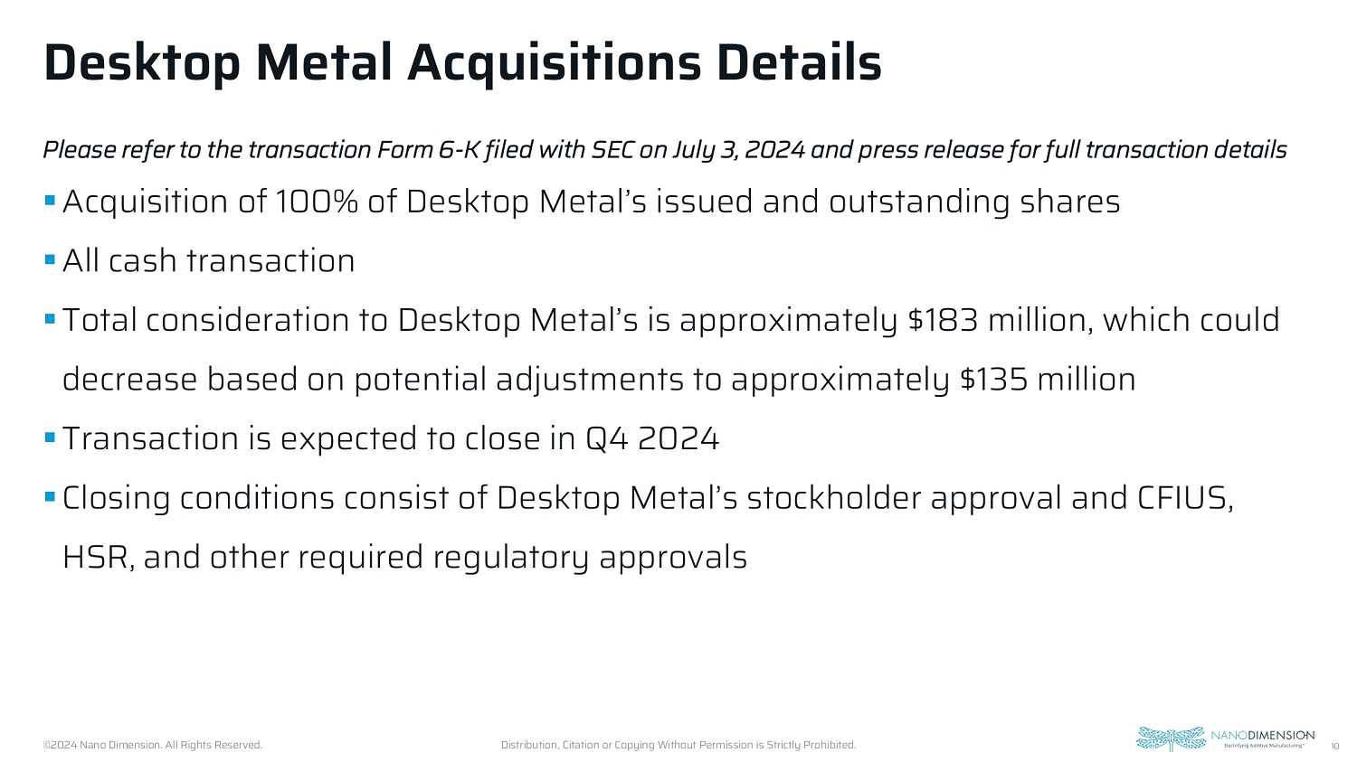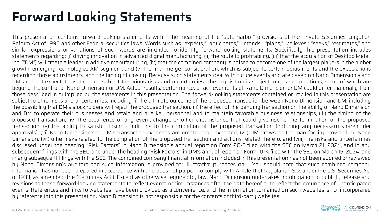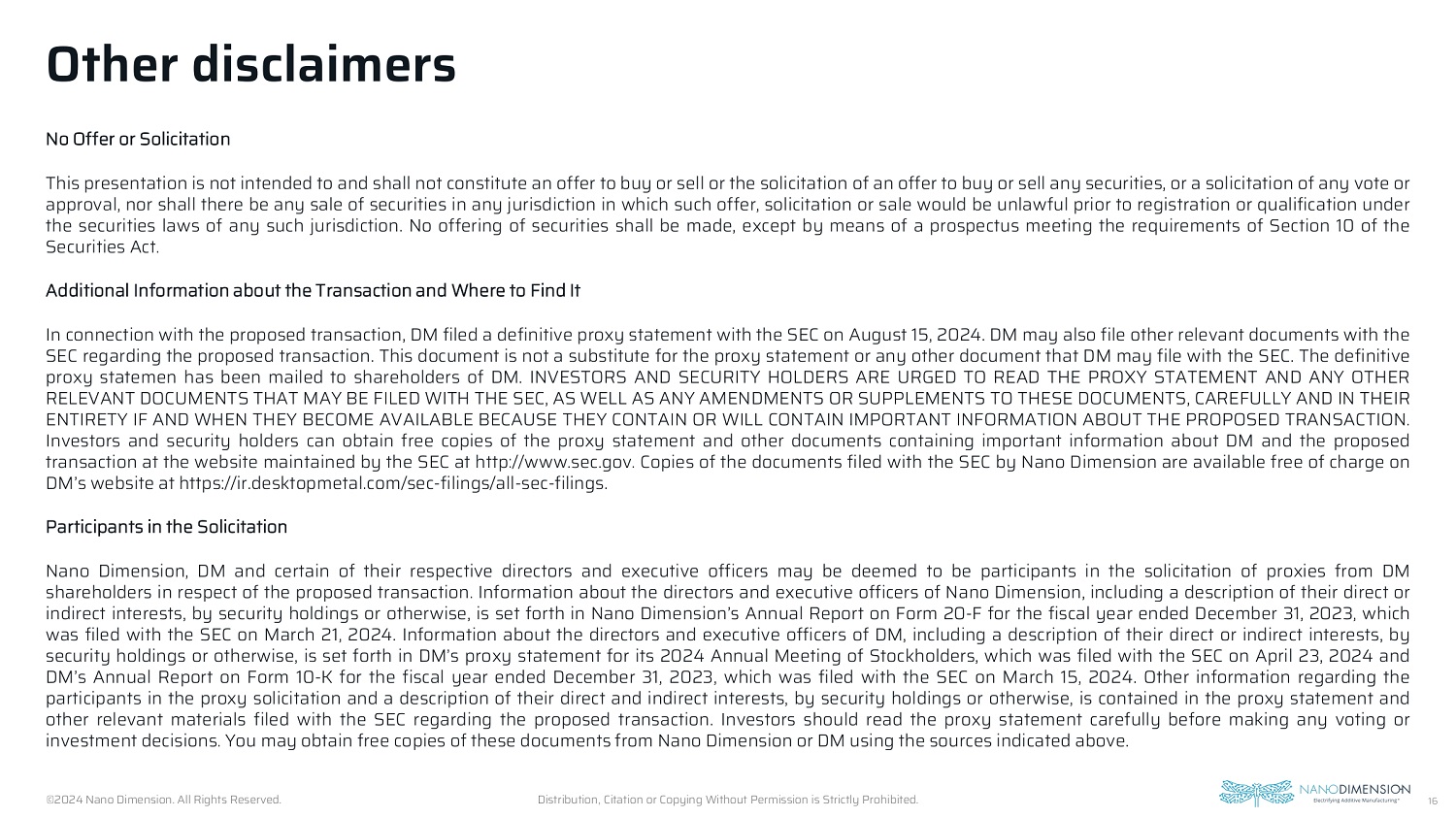 In connection with the proposed transaction, Desktop Metal, Inc. (“Desktop Metal”) filed with the SEC a proxy statement (the “Proxy Statement”) on August 15, 2024. Desktop Metal may also file other relevant documents with the SEC regarding the proposed transaction. This document is not a substitute for the Proxy Statement or any other document that Desktop Metal may file with the SEC. The definitive Proxy Statement has been mailed to shareholders of Desktop Metal. INVESTORS AND SECURITY HOLDERS ARE URGED TO READ THE PROXY STATEMENT AND ANY OTHER RELEVANT DOCUMENTS THAT MAY BE FILED WITH THE SEC, AS WELL AS ANY AMENDMENTS OR SUPPLEMENTS TO THESE DOCUMENTS, CAREFULLY AND IN THEIR ENTIRETY IF AND WHEN THEY BECOME AVAILABLE BECAUSE THEY CONTAIN OR WILL CONTAIN IMPORTANT INFORMATION ABOUT THE PROPOSED TRANSACTION. Investors and security holders can obtain free copies of the Proxy Statement and other documents containing important information about Desktop Metal and the proposed transaction, once such documents are filed with the SEC through the website maintained by the SEC at http://www.sec.gov. Copies of the documents filed with the SEC by the Registrant will be available free of charge on the Registrant’s website at https://investors.nano-di.com/sec-filings-1/default.aspx.