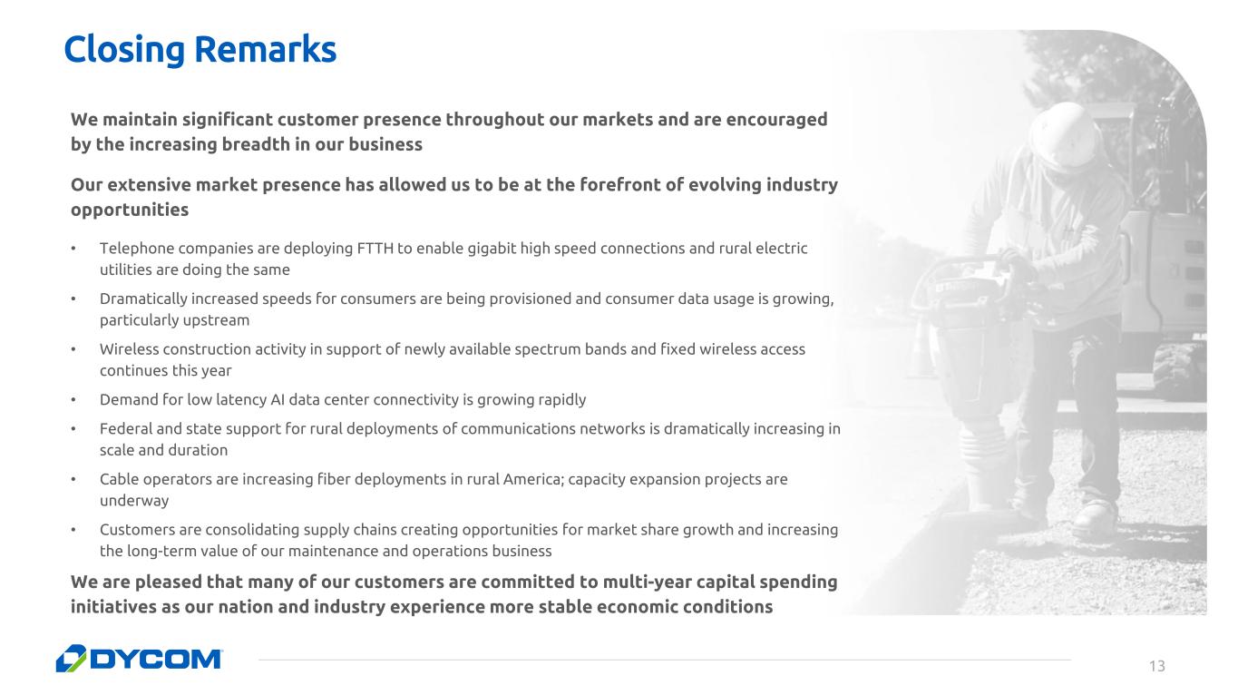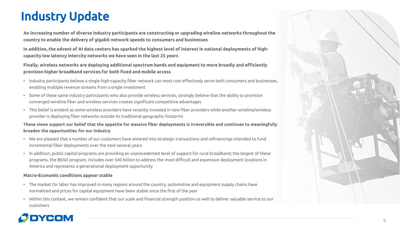 Industry Update 6 An increasing number of diverse industry participants are constructing or upgrading wireline networks throughout the country to enable the delivery of gigabit network speeds to consumers and businesses In addition, the advent of AI data centers has sparked the highest level of interest in national deployments of high- capacity low latency intercity networks we have seen in the last 25 years Finally, wireless networks are deploying additional spectrum bands and equipment to more broadly and efficiently provision higher broadband services for both fixed and mobile access • Industry participants believe a single high-capacity fiber network can most cost effectively serve both consumers and businesses, enabling multiple revenue streams from a single investment • Some of these same industry participants who also provide wireless services, strongly believe that the ability to provision converged wireline fiber and wireless services creates significant competitive advantages • This belief is evident as some wireless providers have recently invested in new fiber providers while another wireline/wireless provider is deploying fiber networks outside its traditional geographic footprint These views support our belief that the appetite for massive fiber deployments is irreversible and continues to meaningfully broaden the opportunities for our industry • We are pleased that a number of our customers have entered into strategic transactions and refinancings intended to fund incremental fiber deployments over the next several years • In addition, public capital programs are providing an unprecedented level of support for rural broadband; the largest of these programs, the BEAD program, includes over $40 billion to address the most difficult and expensive deployment locations in America and represents a generational deployment opportunity Macro-Economic conditions appear stable • The market for labor has improved in many regions around the country; automotive and equipment supply chains have normalized and prices for capital equipment have been stable since the first of the year • Within this context, we remain confident that our scale and financial strength position us well to deliver valuable service to our customers