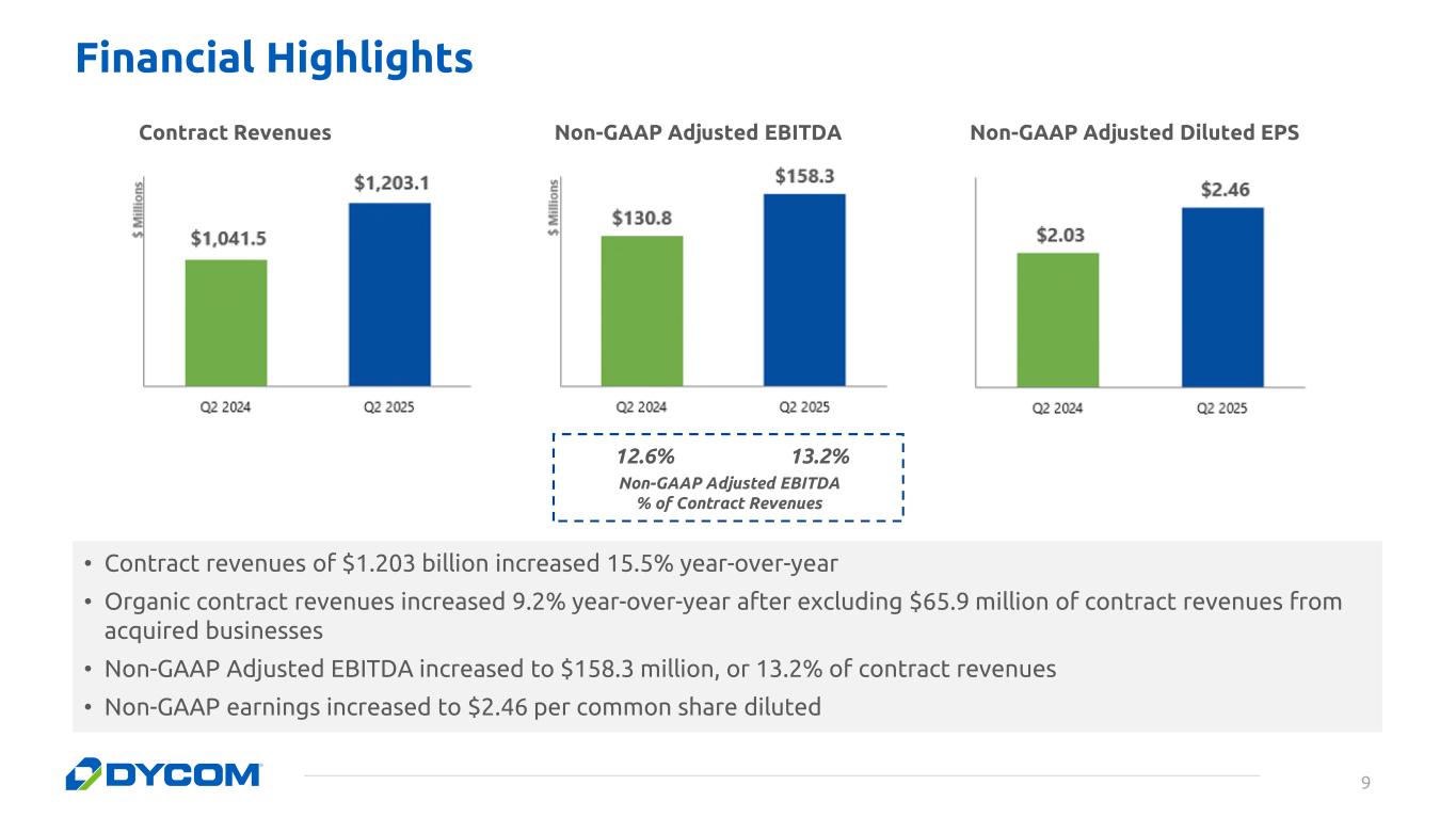 Palm Beach Gardens, Florida, August 21, 2024 - Dycom Industries, Inc. (NYSE: DY) announced today its results for the second quarter ended July 27, 2024. Contract revenues increased 15.5% to $1.203 billion for the quarter ended July 27, 2024, compared to $1.042 billion in the year ago quarter. On an organic basis, contract revenues increased 9.2% after excluding $65.9 million of contract revenues from acquired businesses that were not owned during the year ago quarter.