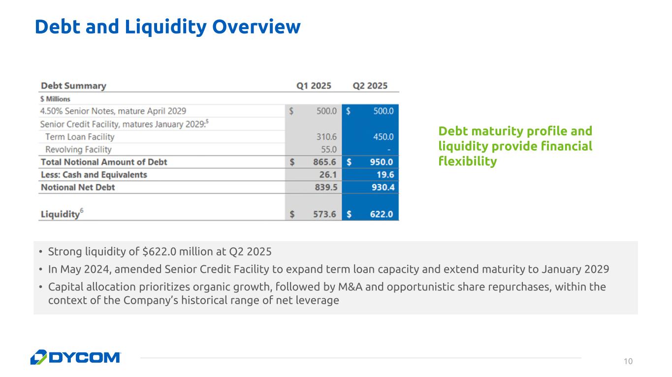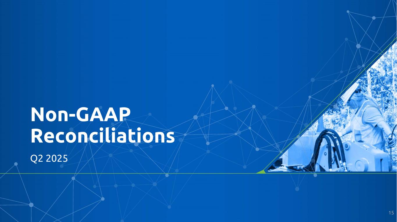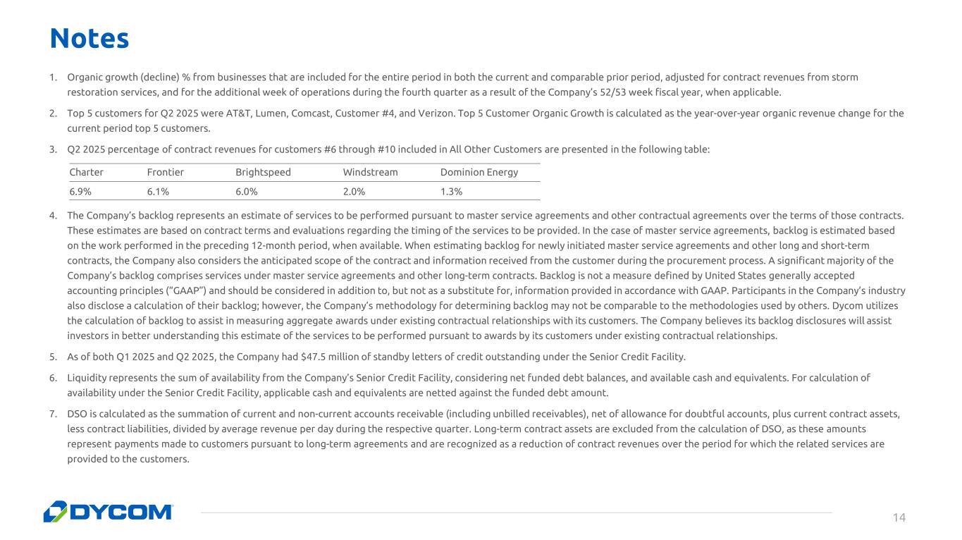 Notes 1. Organic growth (decline) % from businesses that are included for the entire period in both the current and comparable prior period, adjusted for contract revenues from storm restoration services, and for the additional week of operations during the fourth quarter as a result of the Company’s 52/53 week fiscal year, when applicable. 2. Top 5 customers for Q2 2025 were AT&T, Lumen, Comcast, Customer #4, and Verizon. Top 5 Customer Organic Growth is calculated as the year-over-year organic revenue change for the current period top 5 customers. 3. Q2 2025 percentage of contract revenues for customers #6 through #10 included in All Other Customers are presented in the following table: 4. The Company’s backlog represents an estimate of services to be performed pursuant to master service agreements and other contractual agreements over the terms of those contracts. These estimates are based on contract terms and evaluations regarding the timing of the services to be provided. In the case of master service agreements, backlog is estimated based on the work performed in the preceding 12-month period, when available. When estimating backlog for newly initiated master service agreements and other long and short-term contracts, the Company also considers the anticipated scope of the contract and information received from the customer during the procurement process. A significant majority of the Company’s backlog comprises services under master service agreements and other long-term contracts. Backlog is not a measure defined by United States generally accepted accounting principles (“GAAP”) and should be considered in addition to, but not as a substitute for, information provided in accordance with GAAP. Participants in the Company’s industry also disclose a calculation of their backlog; however, the Company’s methodology for determining backlog may not be comparable to the methodologies used by others. Dycom utilizes the calculation of backlog to assist in measuring aggregate awards under existing contractual relationships with its customers. The Company believes its backlog disclosures will assist investors in better understanding this estimate of the services to be performed pursuant to awards by its customers under existing contractual relationships. 5. As of both Q1 2025 and Q2 2025, the Company had $47.5 million of standby letters of credit outstanding under the Senior Credit Facility. 6. Liquidity represents the sum of availability from the Company’s Senior Credit Facility, considering net funded debt balances, and available cash and equivalents. For calculation of availability under the Senior Credit Facility, applicable cash and equivalents are netted against the funded debt amount. 7. DSO is calculated as the summation of current and non-current accounts receivable (including unbilled receivables), net of allowance for doubtful accounts, plus current contract assets, less contract liabilities, divided by average revenue per day during the respective quarter. Long-term contract assets are excluded from the calculation of DSO, as these amounts represent payments made to customers pursuant to long-term agreements and are recognized as a reduction of contract revenues over the period for which the related services are provided to the customers. 14 Charter Frontier Brightspeed Windstream Dominion Energy 6.9% 6.1% 6.0% 2.0% 1.3%