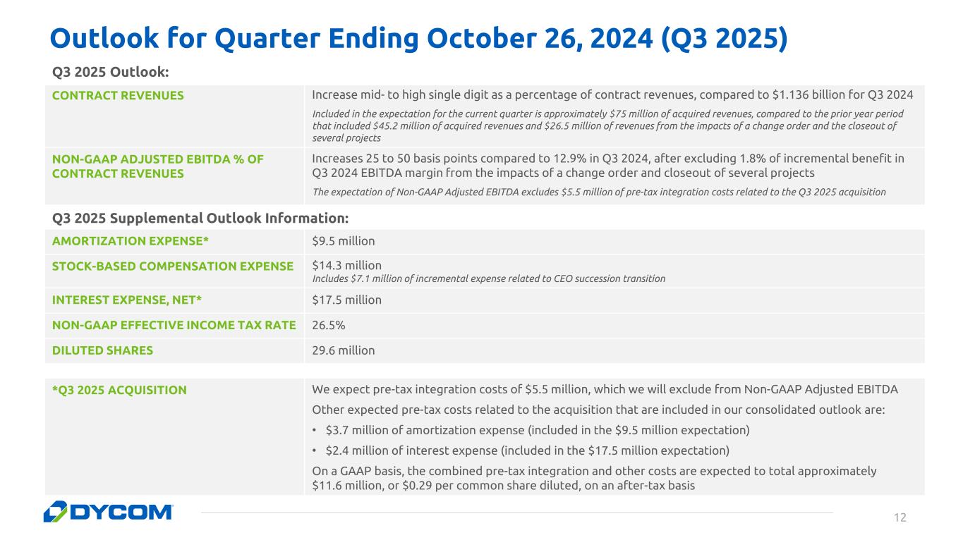 For the quarter ending October 26, 2024, the Company expects total contract revenues to increase mid- to high single digit as a percentage of contract revenues, compared to $1.136 billion for the quarter ended October 28, 2023. Included in the expectation for the current quarter is approximately $75 million of acquired revenues, compared to the prior year period that included $45.2 million of acquired revenues and $26.5 million of revenues from the impacts of a change order and the closeout of several projects.