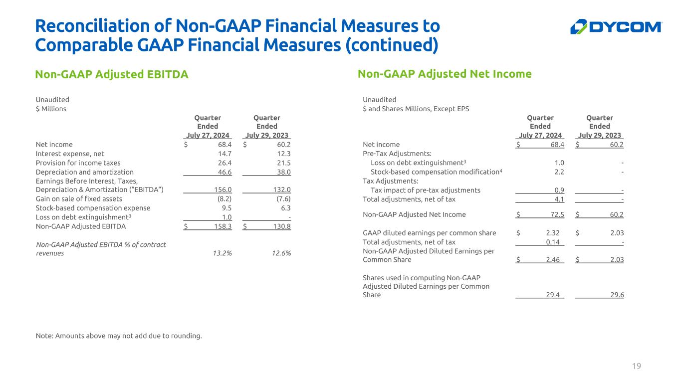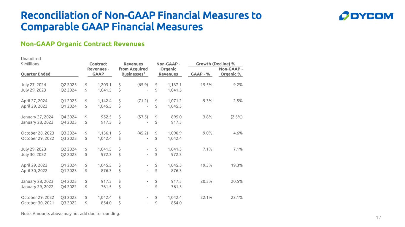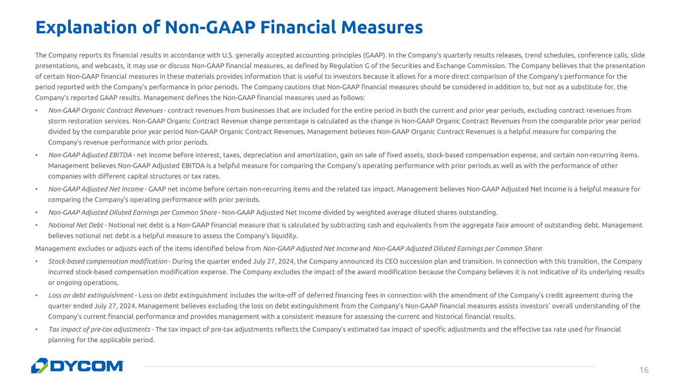 Explanation of Non-GAAP Financial Measures The Company reports its financial results in accordance with U.S. generally accepted accounting principles (GAAP). In the Company’s quarterly results releases, trend schedules, conference calls, slide presentations, and webcasts, it may use or discuss Non-GAAP financial measures, as defined by Regulation G of the Securities and Exchange Commission. The Company believes that the presentation of certain Non-GAAP financial measures in these materials provides information that is useful to investors because it allows for a more direct comparison of the Company’s performance for the period reported with the Company’s performance in prior periods. The Company cautions that Non-GAAP financial measures should be considered in addition to, but not as a substitute for, the Company’s reported GAAP results. Management defines the Non-GAAP financial measures used as follows: • Non-GAAP Organic Contract Revenues - contract revenues from businesses that are included for the entire period in both the current and prior year periods, excluding contract revenues from storm restoration services. Non-GAAP Organic Contract Revenue change percentage is calculated as the change in Non-GAAP Organic Contract Revenues from the comparable prior year period divided by the comparable prior year period Non-GAAP Organic Contract Revenues. Management believes Non-GAAP Organic Contract Revenues is a helpful measure for comparing the Company’s revenue performance with prior periods. • Non-GAAP Adjusted EBITDA - net income before interest, taxes, depreciation and amortization, gain on sale of fixed assets, stock-based compensation expense, and certain non-recurring items. Management believes Non-GAAP Adjusted EBITDA is a helpful measure for comparing the Company’s operating performance with prior periods as well as with the performance of other companies with different capital structures or tax rates. • Non-GAAP Adjusted Net Income - GAAP net income before certain non-recurring items and the related tax impact. Management believes Non-GAAP Adjusted Net Income is a helpful measure for comparing the Company’s operating performance with prior periods. • Non-GAAP Adjusted Diluted Earnings per Common Share - Non-GAAP Adjusted Net Income divided by weighted average diluted shares outstanding. • Notional Net Debt - Notional net debt is a Non-GAAP financial measure that is calculated by subtracting cash and equivalents from the aggregate face amount of outstanding debt. Management believes notional net debt is a helpful measure to assess the Company’s liquidity. Management excludes or adjusts each of the items identified below from Non-GAAP Adjusted Net Income and Non-GAAP Adjusted Diluted Earnings per Common Share: • Stock-based compensation modification - During the quarter ended July 27, 2024, the Company announced its CEO succession plan and transition. In connection with this transition, the Company incurred stock-based compensation modification expense. The Company excludes the impact of the award modification because the Company believes it is not indicative of its underlying results or ongoing operations. • Loss on debt extinguishment - Loss on debt extinguishment includes the write-off of deferred financing fees in connection with the amendment of the Company’s credit agreement during the quarter ended July 27, 2024. Management believes excluding the loss on debt extinguishment from the Company’s Non-GAAP financial measures assists investors’ overall understanding of the Company’s current financial performance and provides management with a consistent measure for assessing the current and historical financial results. • Tax impact of pre-tax adjustments - The tax impact of pre-tax adjustments reflects the Company’s estimated tax impact of specific adjustments and the effective tax rate used for financial planning for the applicable period. 16