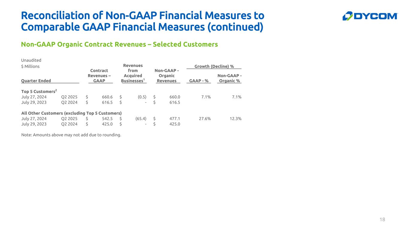 Unaudited $ Millions Contract Revenues - GAAP Revenues from Acquired Businesses1 Non-GAAP - Organic Revenues Growth (Decline) % Quarter Ended GAAP - % Non-GAAP - Organic % July 27, 2024 Q2 2025 $ 1,203.1 $ (65.9) $ 1,137.1 15.5% 9.2% July 29, 2023 Q2 2024 $ 1,041.5 $ - $ 1,041.5 April 27, 2024 Q1 2025 $ 1,142.4 $ (71.2) $ 1,071.2 9.3% 2.5% April 29, 2023 Q1 2024 $ 1,045.5 $ - $ 1,045.5 January 27, 2024 Q4 2024 $ 952.5 $ (57.5) $ 895.0 3.8% (2.5%) January 28, 2023 Q4 2023 $ 917.5 $ - $ 917.5 October 28, 2023 Q3 2024 $ 1,136.1 $ (45.2) $ 1,090.9 9.0% 4.6% October 29, 2022 Q3 2023 $ 1,042.4 $ - $ 1,042.4 July 29, 2023 Q2 2024 $ 1,041.5 $ - $ 1,041.5 7.1% 7.1% July 30, 2022 Q2 2023 $ 972.3 $ - $ 972.3 April 29, 2023 Q1 2024 $ 1,045.5 $ - $ 1,045.5 19.3% 19.3% April 30, 2022 Q1 2023 $ 876.3 $ - $ 876.3 January 28, 2023 Q4 2023 $ 917.5 $ - $ 917.5 20.5% 20.5% January 29, 2022 Q4 2022 $ 761.5 $ - $ 761.5 October 29, 2022 Q3 2023 $ 1,042.4 $ - $ 1,042.4 22.1% 22.1% October 30, 2021 Q3 2022 $ 854.0 $ - $ 854.0 Note: Amounts above may not add due to rounding. Reconciliation of Non-GAAP Financial Measures to Comparable GAAP Financial Measures 17 Non-GAAP Organic Contract Revenues