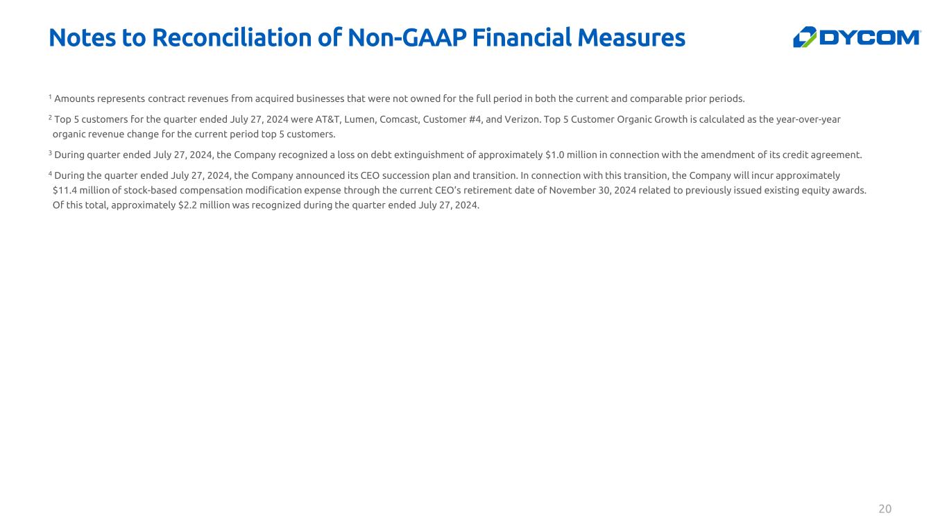 19 Unaudited $ Millions Quarter Ended Quarter Ended July 27, 2024 July 29, 2023 Net income $ 68.4 $ 60.2 Interest expense, net 14.7 12.3 Provision for income taxes 26.4 21.5 Depreciation and amortization 46.6 38.0 Earnings Before Interest, Taxes, Depreciation & Amortization (“EBITDA”) 156.0 132.0 Gain on sale of fixed assets (8.2) (7.6) Stock-based compensation expense 9.5 6.3 Loss on debt extinguishment3 1.0 - Non-GAAP Adjusted EBITDA $ 158.3 $ 130.8 Non-GAAP Adjusted EBITDA % of contract revenues 13.2% 12.6% Note: Amounts above may not add due to rounding. Non-GAAP Adjusted EBITDA Reconciliation of Non-GAAP Financial Measures to Comparable GAAP Financial Measures (continued) Unaudited $ and Shares Millions, Except EPS Quarter Ended Quarter Ended July 27, 2024 July 29, 2023 Net income $ 68.4 $ 60.2 Pre-Tax Adjustments: Loss on debt extinguishment3 1.0 - Stock-based compensation modification4 2.2 - Tax Adjustments: Tax impact of pre-tax adjustments 0.9 - Total adjustments, net of tax 4.1 - Non-GAAP Adjusted Net Income $ 72.5 $ 60.2 GAAP diluted earnings per common share $ 2.32 $ 2.03 Total adjustments, net of tax 0.14 - Non-GAAP Adjusted Diluted Earnings per Common Share $ 2.46 $ 2.03 Shares used in computing Non-GAAP Adjusted Diluted Earnings per Common Share 29.4 29.6 Non-GAAP Adjusted Net Income