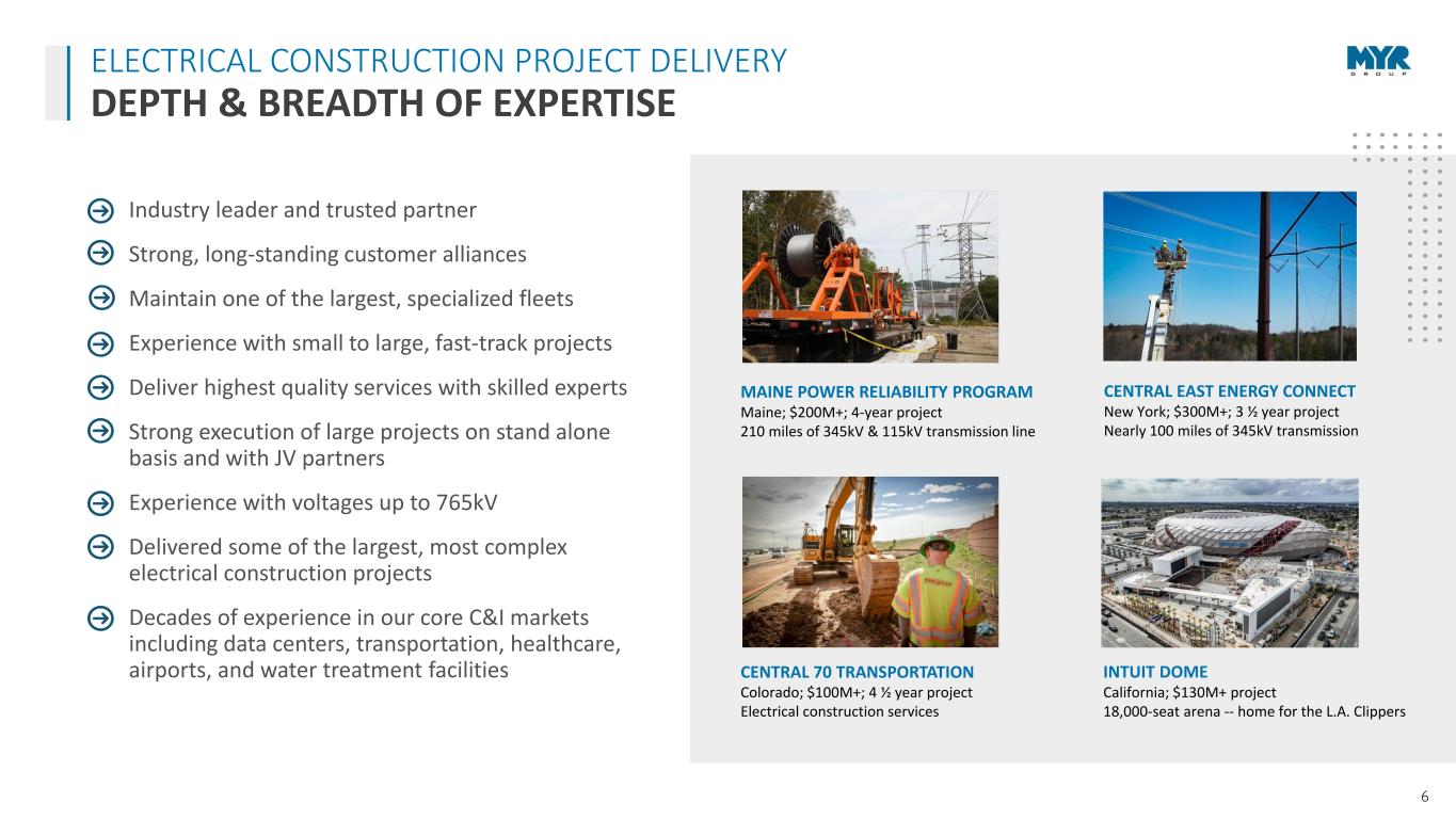 5 • T&D work activity primarily consists of small to medium-sized projects, with some larger transmission, High Voltage Direct Current (HVDC) projects. We continue to execute routine maintenance work under long-term Master Services Agreements (MSAs). Strong, long-term drivers will continue to increase T&D spending. • The core markets we serve in C&I remain active, driven by multiple growth drivers and notable strength in transportation and data center opportunities. • Infrastructure bills could promote increased spending and both MYR Group business segments are well-positioned to benefit from this. • AI is driving growth in data centers and power demand. Data centers have been an important and growing end market for our C&I segment for a long time, while new interconnections, substations and infrastructure upgrades to data centers create additional opportunities for our T&D segment. • Strong balance sheet with $427M in availability under our $490M credit facility and funded debt to LTM EBITDA leverage of 0.33x, which management believes will enable us to meet our working capital needs, support the organic growth of the business, pursue acquisitions, and opportunistically repurchase shares. WHAT WE SEE OUTLOOK
