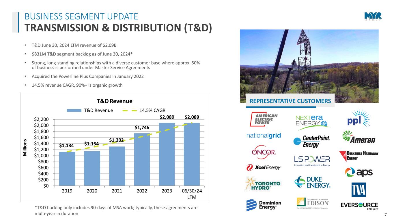 6 ELECTRICAL CONSTRUCTION PROJECT DELIVERY DEPTH & BREADTH OF EXPERTISE Industry leader and trusted partner Strong, long-standing customer alliances Maintain one of the largest, specialized fleets Experience with small to large, fast-track projects Deliver highest quality services with skilled experts Strong execution of large projects on stand alone basis and with JV partners Experience with voltages up to 765kV Delivered some of the largest, most complex electrical construction projects Decades of experience in our core C&I markets including data centers, transportation, healthcare, airports, and water treatment facilities MAINE POWER RELIABILITY PROGRAM Maine; $200M+; 4-year project 210 miles of 345kV & 115kV transmission line CENTRAL 70 TRANSPORTATION Colorado; $100M+; 4 ½ year project Electrical construction services CENTRAL EAST ENERGY CONNECT New York; $300M+; 3 ½ year project Nearly 100 miles of 345kV transmission INTUIT DOME California; $130M+ project 18,000-seat arena -- home for the L.A. Clippers