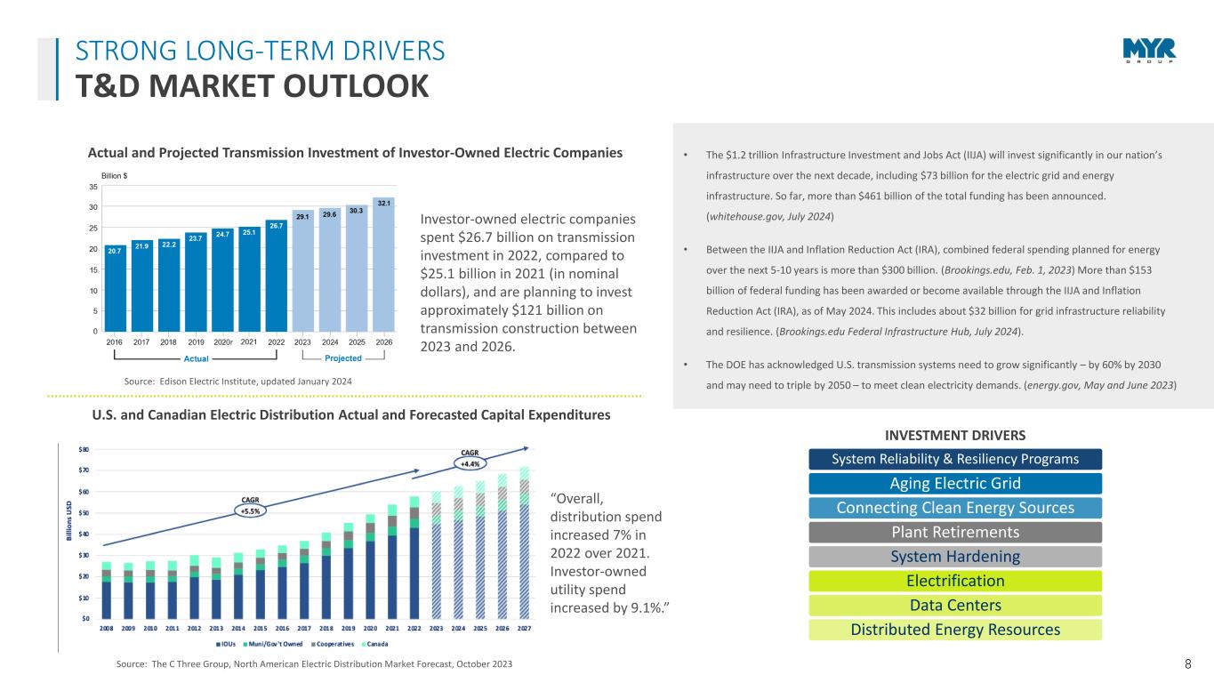 7 • T&D June 30, 2024 LTM revenue of $2.09B • $831M T&D segment backlog as of June 30, 2024* • Strong, long-standing relationships with a diverse customer base where approx. 50% of business is performed under Master Service Agreements • Acquired the Powerline Plus Companies in January 2022 • 14.5% revenue CAGR, 90%+ is organic growth BUSINESS SEGMENT UPDATE TRANSMISSION & DISTRIBUTION (T&D) REPRESENTATIVE CUSTOMERS $1,134 $1,154 $1,302 $1,746 $2,089 $2,089 $0 $200 $400 $600 $800 $1,000 $1,200 $1,400 $1,600 $1,800 $2,000 $2,200 2019 2020 2021 2022 2023 06/30/24 LTM M ill io n s T&D Revenue T&D Revenue 14.5% CAGR *T&D backlog only includes 90-days of MSA work; typically, these agreements are multi-year in duration