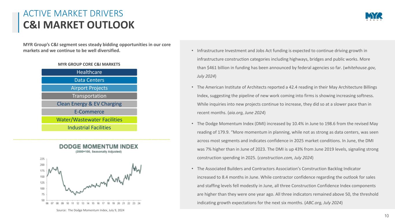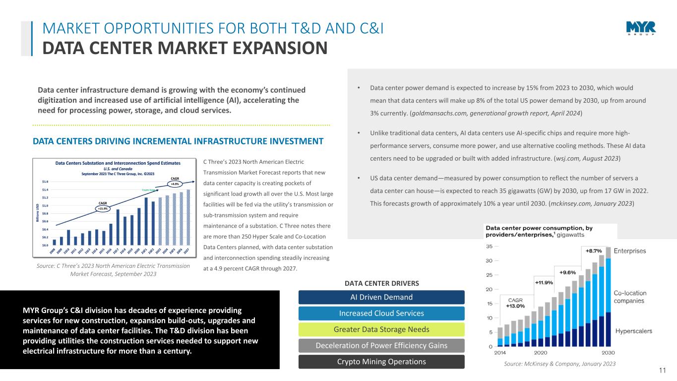10 Healthcare Data Centers Airport Projects Transportation Clean Energy & EV Charging E-Commerce Water/Wastewater Facilities Industrial Facilities MYR GROUP CORE C&I MARKETS ACTIVE MARKET DRIVERS C&I MARKET OUTLOOK • Infrastructure Investment and Jobs Act funding is expected to continue driving growth in infrastructure construction categories including highways, bridges and public works. More than $461 billion in funding has been announced by federal agencies so far. (whitehouse.gov, July 2024) • The American Institute of Architects reported a 42.4 reading in their May Architecture Billings Index, suggesting the pipeline of new work coming into firms is showing increasing softness. While inquiries into new projects continue to increase, they did so at a slower pace than in recent months. (aia.org, June 2024) • The Dodge Momentum Index (DMI) increased by 10.4% in June to 198.6 from the revised May reading of 179.9. “More momentum in planning, while not as strong as data centers, was seen across most segments and indicates confidence in 2025 market conditions. In June, the DMI was 7% higher than in June of 2023. The DMI is up 43% from June 2019 levels, signaling strong construction spending in 2025. (construction.com, July 2024) • The Associated Builders and Contractors Association’s Construction Backlog Indicator increased to 8.4 months in June. While contractor confidence regarding the outlook for sales and staffing levels fell modestly in June, all three Construction Confidence Index components are higher than they were one year ago. All three indicators remained above 50, the threshold indicating growth expectations for the next six months. (ABC.org, July 2024) Source: The Dodge Momentum Index, July 9, 2024 MYR Group’s C&I segment sees steady bidding opportunities in our core markets and we continue to be well diversified.