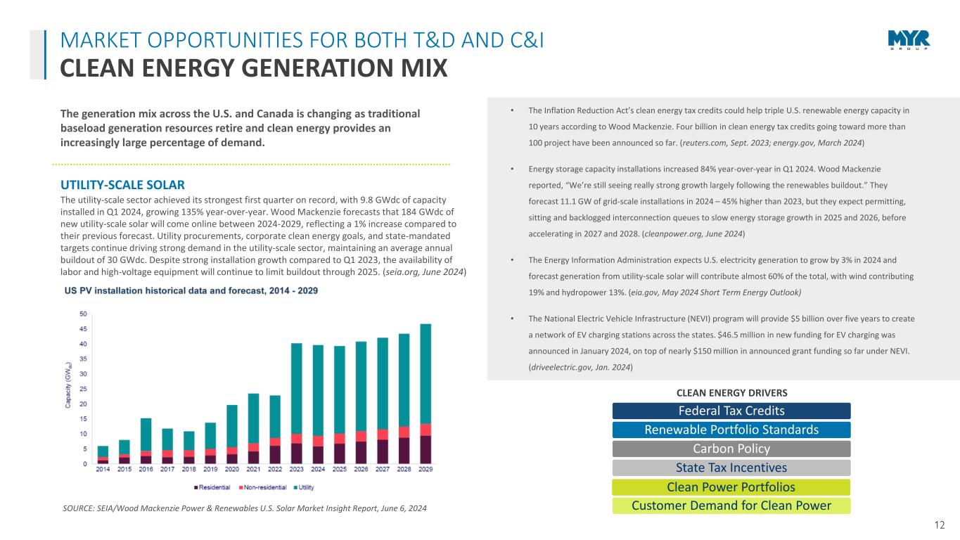 11 MARKET OPPORTUNITIES FOR BOTH T&D AND C&I DATA CENTER MARKET EXPANSION AI Driven Demand Increased Cloud Services Greater Data Storage Needs Deceleration of Power Efficiency Gains Crypto Mining Operations DATA CENTER DRIVERS DATA CENTERS DRIVING INCREMENTAL INFRASTRUCTURE INVESTMENT C Three’s 2023 North American Electric Transmission Market Forecast reports that new data center capacity is creating pockets of significant load growth all over the U.S. Most large facilities will be fed via the utility’s transmission or sub-transmission system and require maintenance of a substation. C Three notes there are more than 250 Hyper Scale and Co-Location Data Centers planned, with data center substation and interconnection spending steadily increasing at a 4.9 percent CAGR through 2027. Data center infrastructure demand is growing with the economy’s continued digitization and increased use of artificial intelligence (AI), accelerating the need for processing power, storage, and cloud services. • Data center power demand is expected to increase by 15% from 2023 to 2030, which would mean that data centers will make up 8% of the total US power demand by 2030, up from around 3% currently. (goldmansachs.com, generational growth report, April 2024) • Unlike traditional data centers, AI data centers use AI-specific chips and require more high- performance servers, consume more power, and use alternative cooling methods. These AI data centers need to be upgraded or built with added infrastructure. (wsj.com, August 2023) • US data center demand—measured by power consumption to reflect the number of servers a data center can house—is expected to reach 35 gigawatts (GW) by 2030, up from 17 GW in 2022. This forecasts growth of approximately 10% a year until 2030. (mckinsey.com, January 2023) MYR Group’s C&I division has decades of experience providing services for new construction, expansion build-outs, upgrades and maintenance of data center facilities. The T&D division has been providing utilities the construction services needed to support new electrical infrastructure for more than a century. Source: C Three’s 2023 North American Electric Transmission Market Forecast, September 2023 Source: McKinsey & Company, January 2023