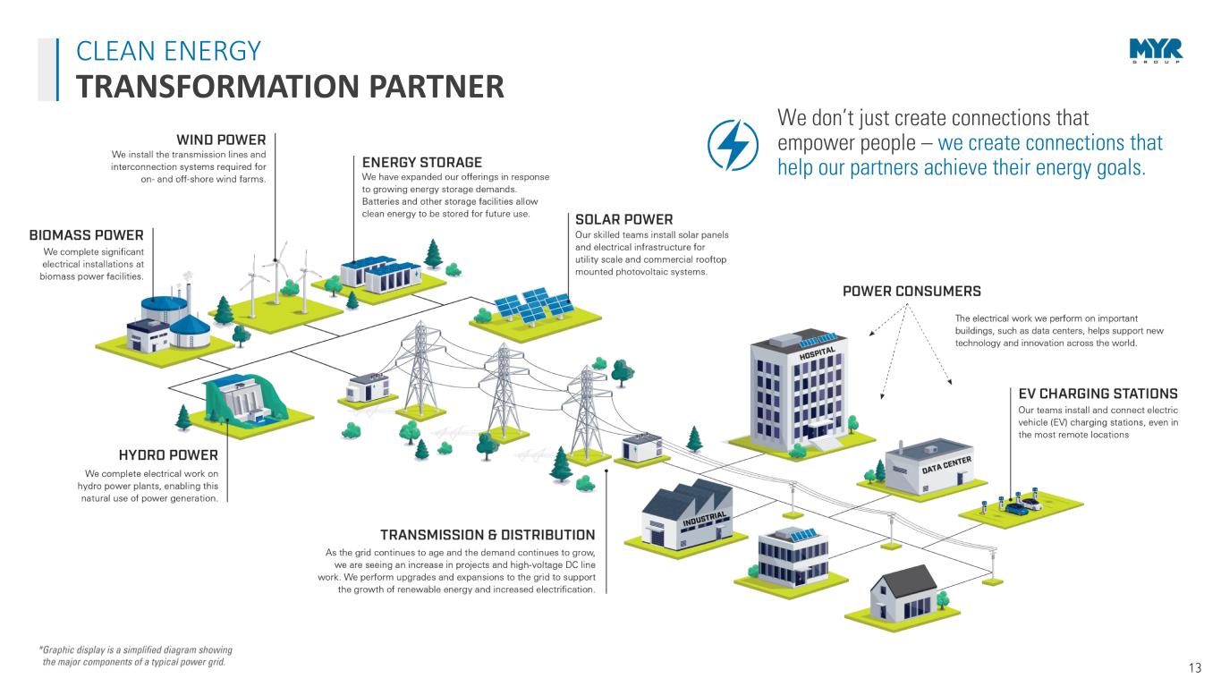 12 MARKET OPPORTUNITIES FOR BOTH T&D AND C&I CLEAN ENERGY GENERATION MIX Federal Tax Credits Renewable Portfolio Standards Carbon Policy State Tax Incentives Clean Power Portfolios Customer Demand for Clean Power CLEAN ENERGY DRIVERS UTILITY-SCALE SOLAR SOURCE: SEIA/Wood Mackenzie Power & Renewables U.S. Solar Market Insight Report, June 6, 2024 The utility-scale sector achieved its strongest first quarter on record, with 9.8 GWdc of capacity installed in Q1 2024, growing 135% year-over-year. Wood Mackenzie forecasts that 184 GWdc of new utility-scale solar will come online between 2024-2029, reflecting a 1% increase compared to their previous forecast. Utility procurements, corporate clean energy goals, and state-mandated targets continue driving strong demand in the utility-scale sector, maintaining an average annual buildout of 30 GWdc. Despite strong installation growth compared to Q1 2023, the availability of labor and high-voltage equipment will continue to limit buildout through 2025. (seia.org, June 2024) The generation mix across the U.S. and Canada is changing as traditional baseload generation resources retire and clean energy provides an increasingly large percentage of demand. • The Inflation Reduction Act’s clean energy tax credits could help triple U.S. renewable energy capacity in 10 years according to Wood Mackenzie. Four billion in clean energy tax credits going toward more than 100 project have been announced so far. (reuters.com, Sept. 2023; energy.gov, March 2024) • Energy storage capacity installations increased 84% year-over-year in Q1 2024. Wood Mackenzie reported, “We’re still seeing really strong growth largely following the renewables buildout.” They forecast 11.1 GW of grid-scale installations in 2024 – 45% higher than 2023, but they expect permitting, sitting and backlogged interconnection queues to slow energy storage growth in 2025 and 2026, before accelerating in 2027 and 2028. (cleanpower.org, June 2024) • The Energy Information Administration expects U.S. electricity generation to grow by 3% in 2024 and forecast generation from utility-scale solar will contribute almost 60% of the total, with wind contributing 19% and hydropower 13%. (eia.gov, May 2024 Short Term Energy Outlook) • The National Electric Vehicle Infrastructure (NEVI) program will provide $5 billion over five years to create a network of EV charging stations across the states. $46.5 million in new funding for EV charging was announced in January 2024, on top of nearly $150 million in announced grant funding so far under NEVI. (driveelectric.gov, Jan. 2024)