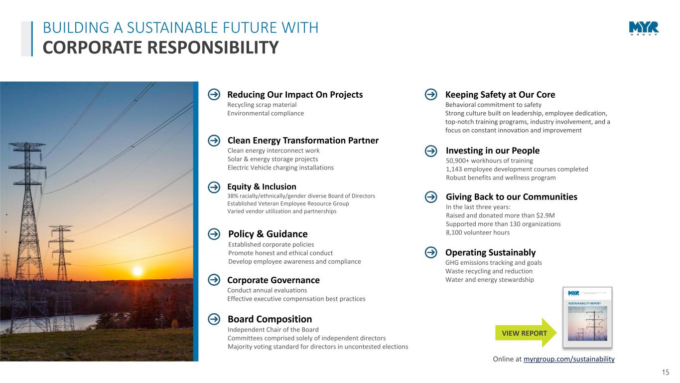 14 STRONG MARKET COUPLED WITH OUR COMPETITIVE EDGE POSITIONS MYR GROUP FOR CONTINUED GROWTH Healthy organic and acquisitive growth Proven execution of corporate strategy Strong financial position Centralized operations for greater efficiency and cross-collaboration Strong presence in key markets with expanding geographic footprint Future-driven mindset to deploy new systems and technologies Broadening our capabilities to support the development of clean energy infrastructure Experienced leadership team Reputation for excellence with customers, with more than 90% return clients in both segments Diversified customer base with no client or contract representing more that 10% of revenue INVESTMENT HIGHLIGHTS U.S./Canada Long-term growth both organically and via acquisition T&D Transmission market outlook strong next 5+ years C&I Well-diversified C&I sector (Transportation, Healthcare, Data Center, EV Infrastructure) Clean Energy Clean energy initiatives driving increased construction spend MYR GROUP STRATEGIC IMPERATIVES FINANCIAL STRENGTH Deliver positive financial results on a consistent basis while positioning the company for growth ORGANIZATIONAL EXCELLENCE Sustain a culture that aids in attracting, retaining, and developing the best people in the industry OPERATIONAL EXCELLENCE Continue investments in people, equipment, health, safety, the environment, technology, innovative programs, process improvement, and sustainability CUSTOMER SATISFACTION Strive to always be the first choice for our clients and remain one of the most reliable, efficient, and high-value providers STRATEGIC GROWTH