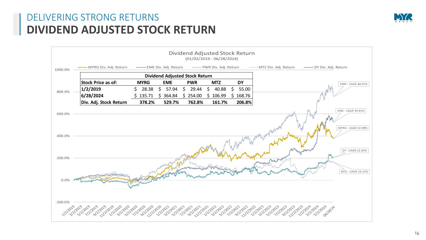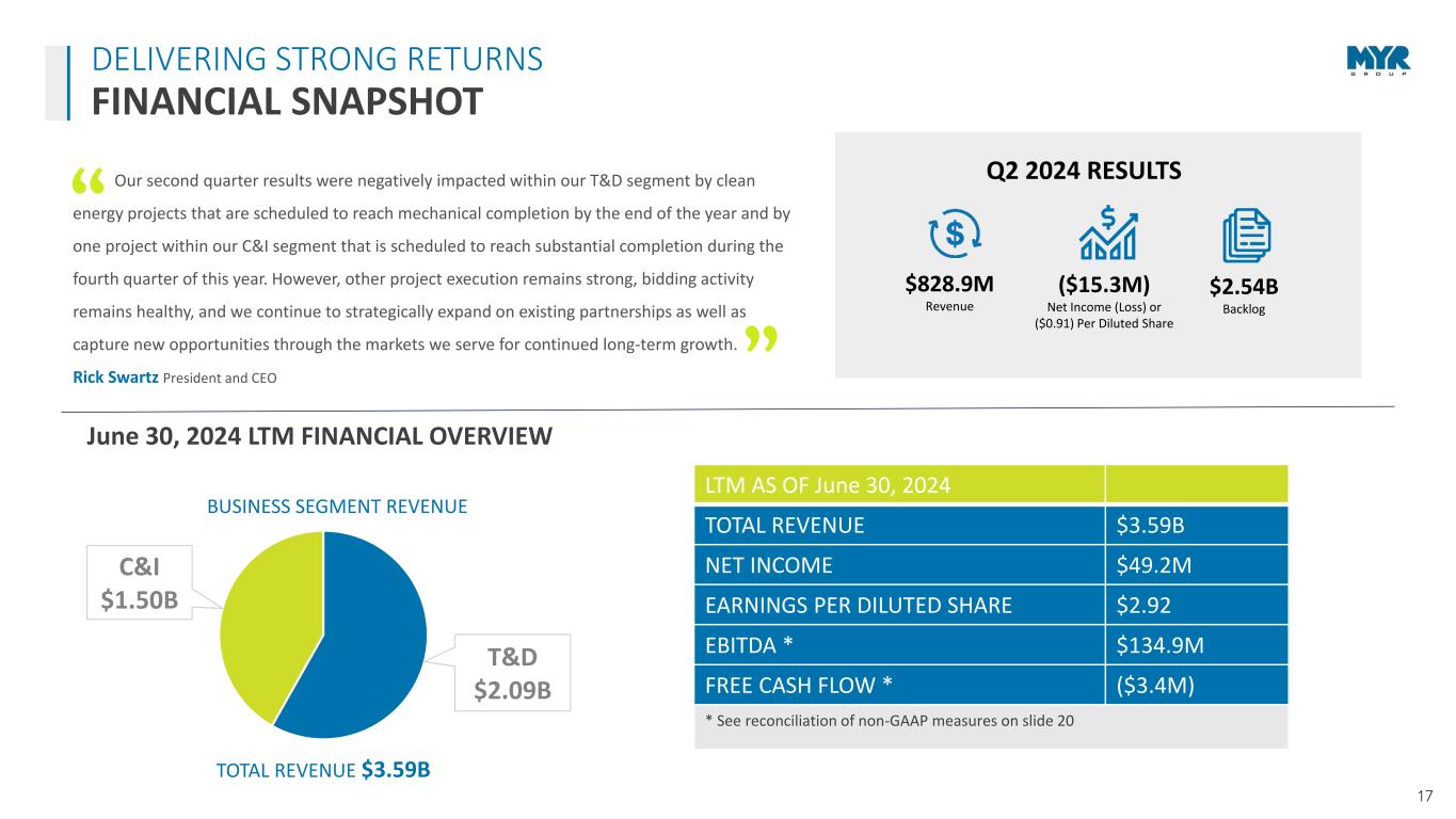 16 DELIVERING STRONG RETURNS DIVIDEND ADJUSTED STOCK RETURN MYRG - CAGR 32.98% EME - CAGR 39.81% PWR - CAGR 48.07% MTZ - CAGR 19.15% DY - CAGR 22.65% -200.0% 0.0% 200.0% 400.0% 600.0% 800.0% 1000.0% Dividend Adjusted Stock Return (01/02/2019 - 06/28/2024) MYRG Div. Adj. Return EME Div. Adj. Return PWR Div. Adj. Return MTZ Div. Adj. Return DY Div. Adj. Return Dividend Adjusted Stock Return Stock Price as of: MYRG EME PWR MTZ DY 1/2/2019 28.38$ 57.94$ 29.44$ 40.88$ 55.00$ 6/28/2024 135.71$ 364.84$ 254.00$ 106.99$ 168.76$ Div. Adj. Stock Return 378.2% 529.7% 762.8% 161.7% 206.8%
