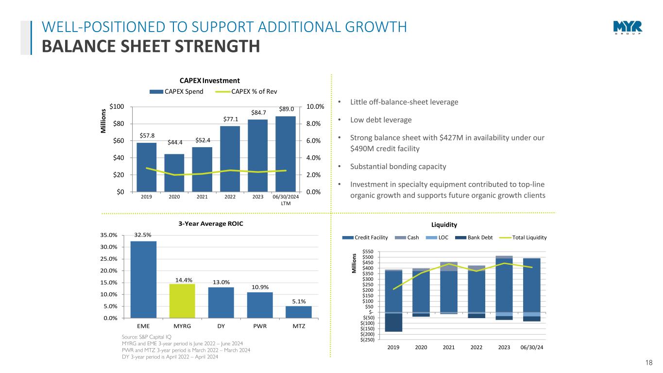 17 Q2 2024 RESULTS ($15.3M) Net Income (Loss) or ($0.91) Per Diluted Share $2.54B Backlog $828.9M Revenue Our second quarter results were negatively impacted within our T&D segment by clean energy projects that are scheduled to reach mechanical completion by the end of the year and by one project within our C&I segment that is scheduled to reach substantial completion during the fourth quarter of this year. However, other project execution remains strong, bidding activity remains healthy, and we continue to strategically expand on existing partnerships as well as capture new opportunities through the markets we serve for continued long-term growth. Rick Swartz President and CEO “ ” DELIVERING STRONG RETURNS FINANCIAL SNAPSHOT T&D $2.09B C&I $1.50B BUSINESS SEGMENT REVENUE LTM AS OF June 30, 2024 TOTAL REVENUE $3.59B NET INCOME $49.2M EARNINGS PER DILUTED SHARE $2.92 EBITDA * $134.9M FREE CASH FLOW * ($3.4M) * See reconciliation of non-GAAP measures on slide 20 June 30, 2024 LTM FINANCIAL OVERVIEW TOTAL REVENUE $3.59B