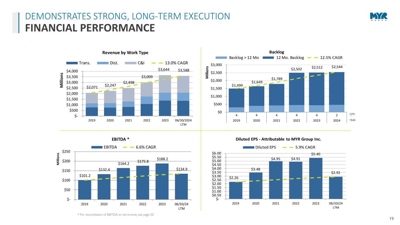 18 $57.8 $44.4 $52.4 $77.1 $84.7 $89.0 0.0% 2.0% 4.0% 6.0% 8.0% 10.0% $0 $20 $40 $60 $80 $100 2019 2020 2021 2022 2023 06/30/2024 LTM M il li o n s CAPEX Investment CAPEX Spend CAPEX % of Rev 32.5% 14.4% 13.0% 10.9% 5.1% 0.0% 5.0% 10.0% 15.0% 20.0% 25.0% 30.0% 35.0% EME MYRG DY PWR MTZ 3-Year Average ROIC $(250) $(200) $(150) $(100) $(50) $- $50 $100 $150 $200 $250 $300 $350 $400 $450 $500 $550 2019 2020 2021 2022 2023 06/30/24 M ill io n s Liquidity Credit Facility Cash LOC Bank Debt Total Liquidity Source: S&P Capital IQ MYRG and EME 3-year period is June 2022 – June 2024 PWR and MTZ 3-year period is March 2022 – March 2024 DY 3-year period is April 2022 – April 2024 • Little off-balance-sheet leverage • Low debt leverage • Strong balance sheet with $427M in availability under our $490M credit facility • Substantial bonding capacity • Investment in specialty equipment contributed to top-line organic growth and supports future organic growth clients WELL-POSITIONED TO SUPPORT ADDITIONAL GROWTH BALANCE SHEET STRENGTH