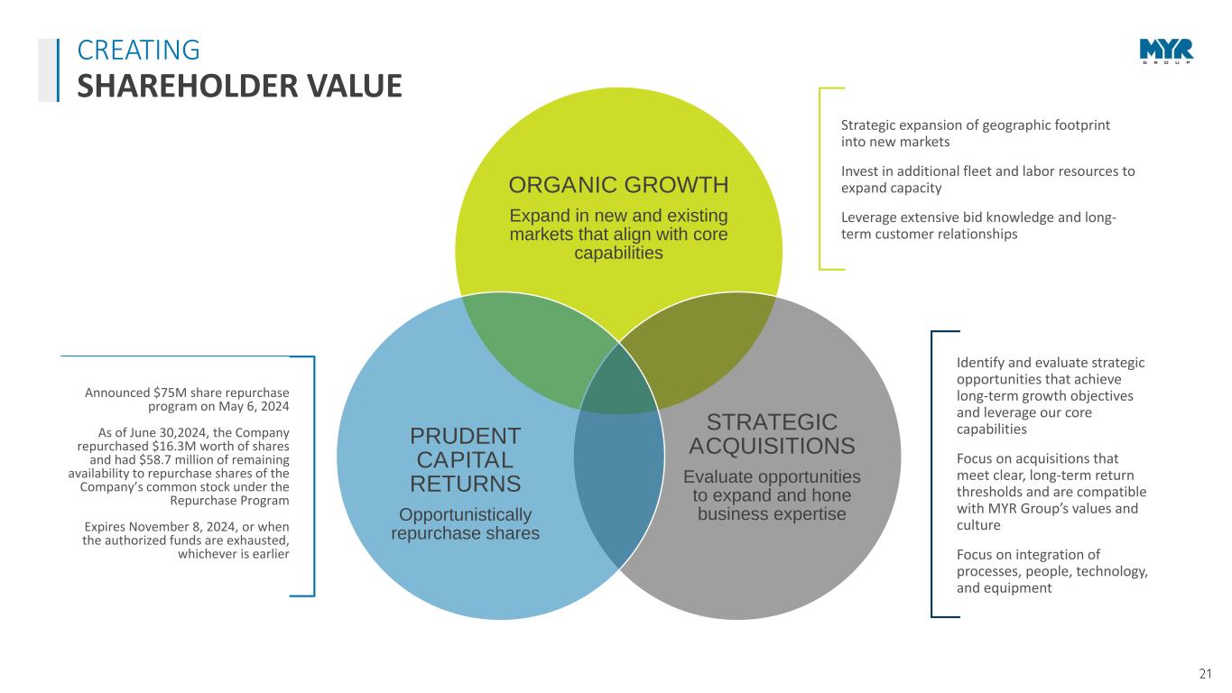 19 $2,071 $2,247 $2,498 $3,009 $3,644 $3,588 $- $500 $1,000 $1,500 $2,000 $2,500 $3,000 $3,500 $4,000 2019 2020 2021 2022 2023 06/30/2024 LTM M ill io n s Revenue by Work Type Trans. Dist. C&I 13.0% CAGR $1,499 $1,649 $1,789 $2,502 $2,512 $2,544 $0 $500 $1,000 $1,500 $2,000 $2,500 $3,000 4 4 4 4 4 2 2019 2020 2021 2022 2023 2024 M ill io n s Backlog Backlog > 12 Mo 12 Mo. Backlog 12.5% CAGR $101.2 $132.4 $164.2 $175.8 $188.2 $134.9 $- $50 $100 $150 $200 $250 2019 2020 2021 2022 2023 06/30/24 LTM M il li o n s EBITDA * EBITDA 6.6% CAGR $2.26 $3.48 $4.95 $4.91 $5.40 $2.92 $- $0.50 $1.00 $1.50 $2.00 $2.50 $3.00 $3.50 $4.00 $4.50 $5.00 $5.50 $6.00 2019 2020 2021 2022 2023 06/30/24 LTM Diluted EPS - Attributable to MYR Group Inc. Diluted EPS 5.9% CAGR * For reconciliation of EBITDA to net income, see page 20 QTR YEAR DEMONSTRATES STRONG, LONG-TERM EXECUTION FINANCIAL PERFORMANCE