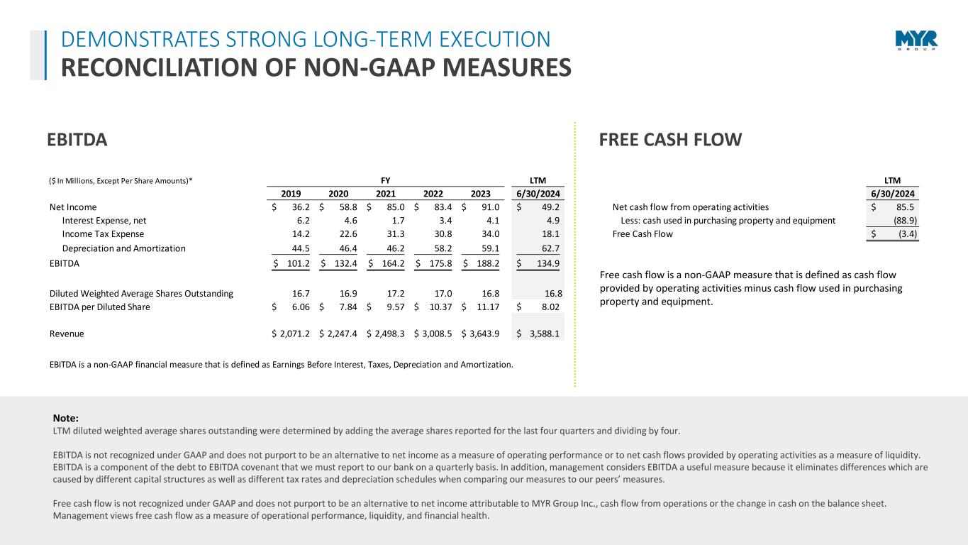 22 Note: LTM diluted weighted average shares outstanding were determined by adding the average shares reported for the last four quarters and dividing by four. EBITDA is not recognized under GAAP and does not purport to be an alternative to net income as a measure of operating performance or to net cash flows provided by operating activities as a measure of liquidity. EBITDA is a component of the debt to EBITDA covenant that we must report to our bank on a quarterly basis. In addition, management considers EBITDA a useful measure because it eliminates differences which are caused by different capital structures as well as different tax rates and depreciation schedules when comparing our measures to our peers’ measures. Free cash flow is not recognized under GAAP and does not purport to be an alternative to net income attributable to MYR Group Inc., cash flow from operations or the change in cash on the balance sheet. Management views free cash flow as a measure of operational performance, liquidity, and financial health. ($ In Millions, Except Per Share Amounts)* FY LTM LTM 2019 2020 2021 2022 2023 6/30/2024 6/30/2024 Net Income 36.2$ 58.8$ 85.0$ 83.4$ 91.0$ 49.2$ Net cash flow from operating activities 85.5$ Interest Expense, net 6.2 4.6 1.7 3.4 4.1 4.9 Less: cash used in purchasing property and equipment (88.9) Income Tax Expense 14.2 22.6 31.3 30.8 34.0 18.1 Free Cash Flow (3.4)$ Depreciation and Amortization 44.5 46.4 46.2 58.2 59.1 62.7 EBITDA 101.2$ 132.4$ 164.2$ 175.8$ 188.2$ 134.9$ Diluted Weighted Average Shares Outstanding 16.7 16.9 17.2 17.0 16.8 16.8 EBITDA per Diluted Share 6.06$ 7.84$ 9.57$ 10.37$ 11.17$ 8.02$ Revenue 2,071.2$ 2,247.4$ 2,498.3$ 3,008.5$ 3,643.9$ 3,588.1$ EBITDA is a non-GAAP financial measure that is defined as Earnings Before Interest, Taxes, Depreciation and Amortization. Free cash flow is a non-GAAP measure that is defined as cash flow provided by operating activities minus cash flow used in purchasing property and equipment. EBITDA FREE CASH FLOW DEMONSTRATES STRONG LONG-TERM EXECUTION RECONCILIATION OF NON-GAAP MEASURES