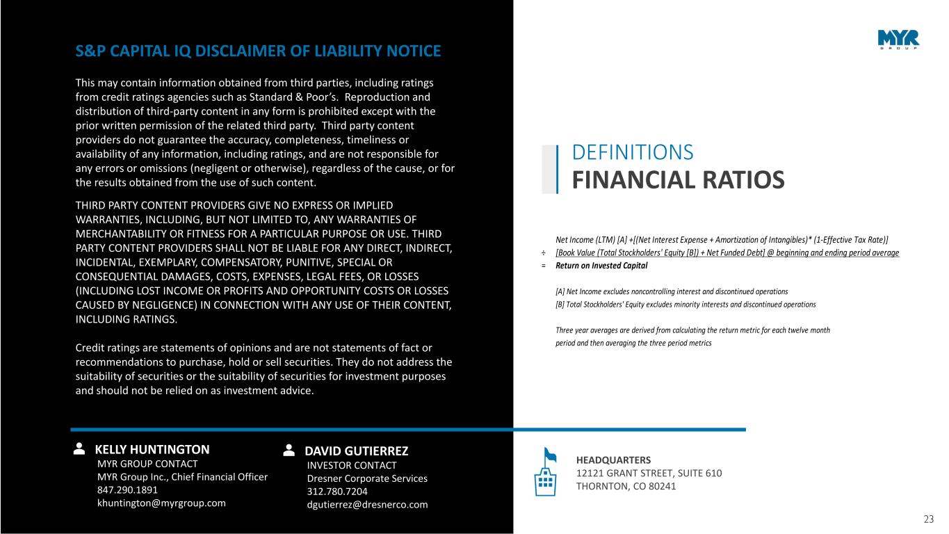 23NOTE: Images used throughout this presentation may have been taken before COVID. Net Income (LTM) [A] +[(Net Interest Expense + Amortization of Intangibles)* (1-Effective Tax Rate)] ÷ [Book Value (Total Stockholders' Equity [B]) + Net Funded Debt] @ beginning and ending period average = Return on Invested Capital [A] Net Income excludes noncontrolling interest and discontinued operations [B] Total Stockholders' Equity excludes minority interests and discontinued operations Three year averages are derived from calculating the return metric for each twelve month period and then averaging the three period metrics S&P CAPITAL IQ DISCLAIMER OF LIABILITY NOTICE This may contain information obtained from third parties, including ratings from credit ratings agencies such as Standard & Poor’s. Reproduction and distribution of third-party content in any form is prohibited except with the prior written permission of the related third party. Third party content providers do not guarantee the accuracy, completeness, timeliness or availability of any information, including ratings, and are not responsible for any errors or omissions (negligent or otherwise), regardless of the cause, or for the results obtained from the use of such content. THIRD PARTY CONTENT PROVIDERS GIVE NO EXPRESS OR IMPLIED WARRANTIES, INCLUDING, BUT NOT LIMITED TO, ANY WARRANTIES OF MERCHANTABILITY OR FITNESS FOR A PARTICULAR PURPOSE OR USE. THIRD PARTY CONTENT PROVIDERS SHALL NOT BE LIABLE FOR ANY DIRECT, INDIRECT, INCIDENTAL, EXEMPLARY, COMPENSATORY, PUNITIVE, SPECIAL OR CONSEQUENTIAL DAMAGES, COSTS, EXPENSES, LEGAL FEES, OR LOSSES (INCLUDING LOST INCOME OR PROFITS AND OPPORTUNITY COSTS OR LOSSES CAUSED BY NEGLIGENCE) IN CONNECTION WITH ANY USE OF THEIR CONTENT, INCLUDING RATINGS. Credit ratings are statements of opinions and are not statements of fact or recommendations to purchase, hold or sell securities. They do not address the suitability of securities or the suitability of securities for investment purposes and should not be relied on as investment advice. DAVID GUTIERREZ INVESTOR CONTACT Dresner Corporate Services 312.780.7204 dgutierrez@dresnerco.com KELLY HUNTINGTON MYR GROUP CONTACT MYR Group Inc., Chief Financial Officer 847.290.1891 khuntington@myrgroup.com HEADQUARTERS 12121 GRANT STREET, SUITE 610 THORNTON, CO 80241 DEFINITIONS FINANCIAL RATIOS