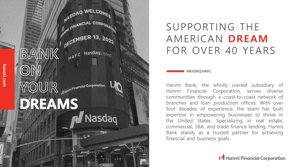 hanmi.com Hanmi Hanmi wholly owned subsidiary of Corporation, serves diverse communities through a coast - to - coast network of branches and loan production offices . With over four decades of experience, the team has built expertise in empowering businesses to thrive in the United States . Specializing in real estate, commercial, SBA, and trade finance lending, Hanmi Bank stands as a trusted partner for achieving financial and business goals . NASDAQ:HAFC Bank, the Financial SUPPORTING THE AMERICAN DREAM FOR OVER 40 YEARS 4