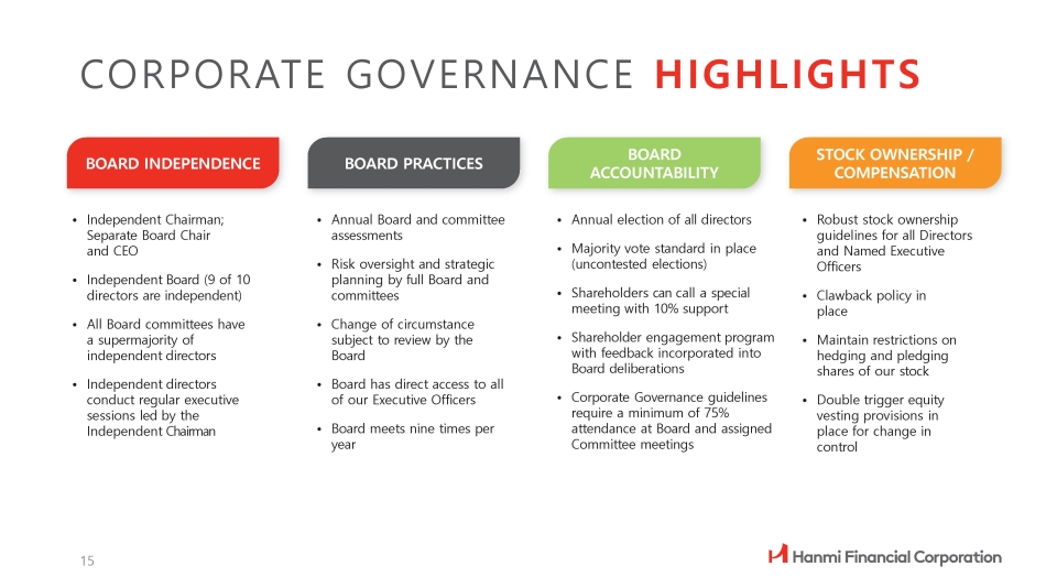 hanmi.com Number of Board and Committee Meetings Held in 2023: 9 Full Board 12 Audit Committee 7 Compensation & Human Resources Committee 4 Nomination & Corporate Governance Committee 8 Risk, Compliance & Planning Committee 4 Asset Liability Management Committee 6 Loan & Credit Policy Committee GOVERNANCE BY THE NUMBERS 14