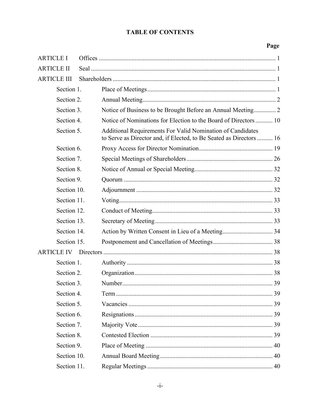 TABLE OF CONTENTS Page -i- ARTICLE I Offices ................................................................................................................. 1 ARTICLE II Seal ...................................................................................................................... 1 ARTICLE III Shareholders ........................................................................................................ 1 Section 1. Place of Meetings .................................................................................. 1 Section 2. Annual Meeting ..................................................................................... 2 Section 3. Notice of Business to be Brought Before an Annual Meeting .............. 2 Section 4. Notice of Nominations for Election to the Board of Directors ........... 10 Section 5. Additional Requirements For Valid Nomination of Candidates to Serve as Director and, if Elected, to Be Seated as Directors .......... 16 Section 6. Proxy Access for Director Nomination ............................................... 19 Section 7. Special Meetings of Shareholders ....................................................... 26 Section 8. Notice of Annual or Special Meeting.................................................. 32 Section 9. Quorum ............................................................................................... 32 Section 10. Adjournment ....................................................................................... 32 Section 11. Voting .................................................................................................. 33 Section 12. Conduct of Meeting............................................................................. 33 Section 13. Secretary of Meeting ........................................................................... 33 Section 14. Action by Written Consent in Lieu of a Meeting ................................ 34 Section 15. Postponement and Cancellation of Meetings ...................................... 38 ARTICLE IV Directors ............................................................................................................ 38 Section 1. Authority ............................................................................................. 38 Section 2. Organization ........................................................................................ 38 Section 3. Number ................................................................................................ 39 Section 4. Term .................................................................................................... 39 Section 5. Vacancies ............................................................................................ 39 Section 6. Resignations ........................................................................................ 39 Section 7. Majority Vote ...................................................................................... 39 Section 8. Contested Election .............................................................................. 39 Section 9. Place of Meeting ................................................................................. 40 Section 10. Annual Board Meeting ........................................................................ 40 Section 11. Regular Meetings ................................................................................ 40