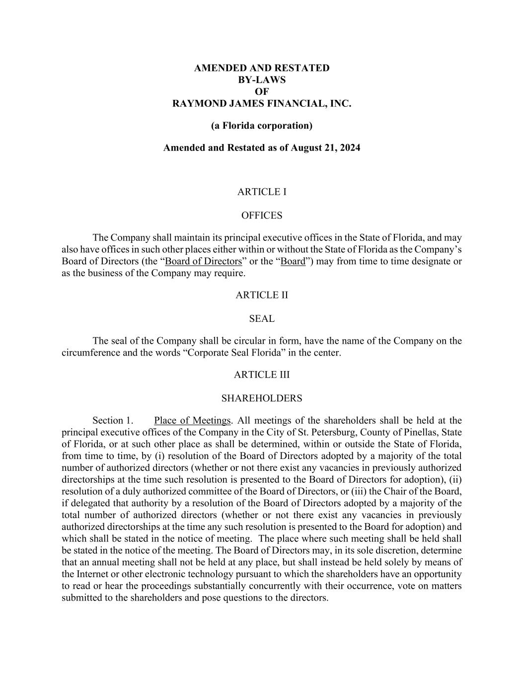 AMENDED AND RESTATED BY-LAWS OF RAYMOND JAMES FINANCIAL, INC. (a Florida corporation) Amended and Restated as of August 21, 2024 ARTICLE I OFFICES The Company shall maintain its principal executive offices in the State of Florida, and may also have offices in such other places either within or without the State of Florida as the Company’s Board of Directors (the “Board of Directors” or the “Board”) may from time to time designate or as the business of the Company may require. ARTICLE II SEAL The seal of the Company shall be circular in form, have the name of the Company on the circumference and the words “Corporate Seal Florida” in the center. ARTICLE III SHAREHOLDERS Section 1. Place of Meetings. All meetings of the shareholders shall be held at the principal executive offices of the Company in the City of St. Petersburg, County of Pinellas, State of Florida, or at such other place as shall be determined, within or outside the State of Florida, from time to time, by (i) resolution of the Board of Directors adopted by a majority of the total number of authorized directors (whether or not there exist any vacancies in previously authorized directorships at the time such resolution is presented to the Board of Directors for adoption), (ii) resolution of a duly authorized committee of the Board of Directors, or (iii) the Chair of the Board, if delegated that authority by a resolution of the Board of Directors adopted by a majority of the total number of authorized directors (whether or not there exist any vacancies in previously authorized directorships at the time any such resolution is presented to the Board for adoption) and which shall be stated in the notice of meeting. The place where such meeting shall be held shall be stated in the notice of the meeting. The Board of Directors may, in its sole discretion, determine that an annual meeting shall not be held at any place, but shall instead be held solely by means of the Internet or other electronic technology pursuant to which the shareholders have an opportunity to read or hear the proceedings substantially concurrently with their occurrence, vote on matters submitted to the shareholders and pose questions to the directors.