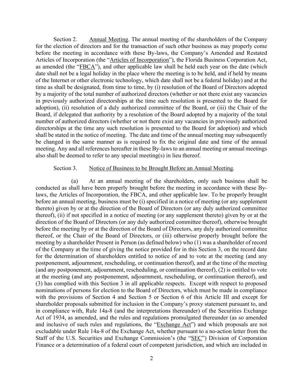 2 Section 2. Annual Meeting. The annual meeting of the shareholders of the Company for the election of directors and for the transaction of such other business as may properly come before the meeting in accordance with these By-laws, the Company’s Amended and Restated Articles of Incorporation (the “Articles of Incorporation”), the Florida Business Corporation Act, as amended (the “FBCA”), and other applicable law shall be held each year on the date (which date shall not be a legal holiday in the place where the meeting is to be held, and if held by means of the Internet or other electronic technology, which date shall not be a federal holiday) and at the time as shall be designated, from time to time, by (i) resolution of the Board of Directors adopted by a majority of the total number of authorized directors (whether or not there exist any vacancies in previously authorized directorships at the time such resolution is presented to the Board for adoption), (ii) resolution of a duly authorized committee of the Board, or (iii) the Chair of the Board, if delegated that authority by a resolution of the Board adopted by a majority of the total number of authorized directors (whether or not there exist any vacancies in previously authorized directorships at the time any such resolution is presented to the Board for adoption) and which shall be stated in the notice of meeting. The date and time of the annual meeting may subsequently be changed in the same manner as is required to fix the original date and time of the annual meeting. Any and all references hereafter in these By-laws to an annual meeting or annual meetings also shall be deemed to refer to any special meeting(s) in lieu thereof. Section 3. Notice of Business to be Brought Before an Annual Meeting. At an annual meeting of the shareholders, only such business shall be conducted as shall have been properly brought before the meeting in accordance with these By- laws, the Articles of Incorporation, the FBCA, and other applicable law. To be properly brought before an annual meeting, business must be (i) specified in a notice of meeting (or any supplement thereto) given by or at the direction of the Board of Directors (or any duly authorized committee thereof), (ii) if not specified in a notice of meeting (or any supplement thereto) given by or at the direction of the Board of Directors (or any duly authorized committee thereof), otherwise brought before the meeting by or at the direction of the Board of Directors, any duly authorized committee thereof, or the Chair of the Board of Directors, or (iii) otherwise properly brought before the meeting by a shareholder Present in Person (as defined below) who (1) was a shareholder of record of the Company at the time of giving the notice provided for in this Section 3, on the record date for the determination of shareholders entitled to notice of and to vote at the meeting (and any postponement, adjournment, rescheduling, or continuation thereof), and at the time of the meeting (and any postponement, adjournment, rescheduling, or continuation thereof), (2) is entitled to vote at the meeting (and any postponement, adjournment, rescheduling, or continuation thereof), and (3) has complied with this Section 3 in all applicable respects. Except with respect to proposed nominations of persons for election to the Board of Directors, which must be made in compliance with the provisions of Section 4 and Section 5 or Section 6 of this Article III and except for shareholder proposals submitted for inclusion in the Company’s proxy statement pursuant to, and in compliance with, Rule 14a-8 (and the interpretations thereunder) of the Securities Exchange Act of 1934, as amended, and the rules and regulations promulgated thereunder (as so amended and inclusive of such rules and regulations, the “Exchange Act”) and which proposals are not excludable under Rule 14a-8 of the Exchange Act, whether pursuant to a no-action letter from the Staff of the U.S. Securities and Exchange Commission’s (the “SEC”) Division of Corporation Finance or a determination of a federal court of competent jurisdiction, and which are included in