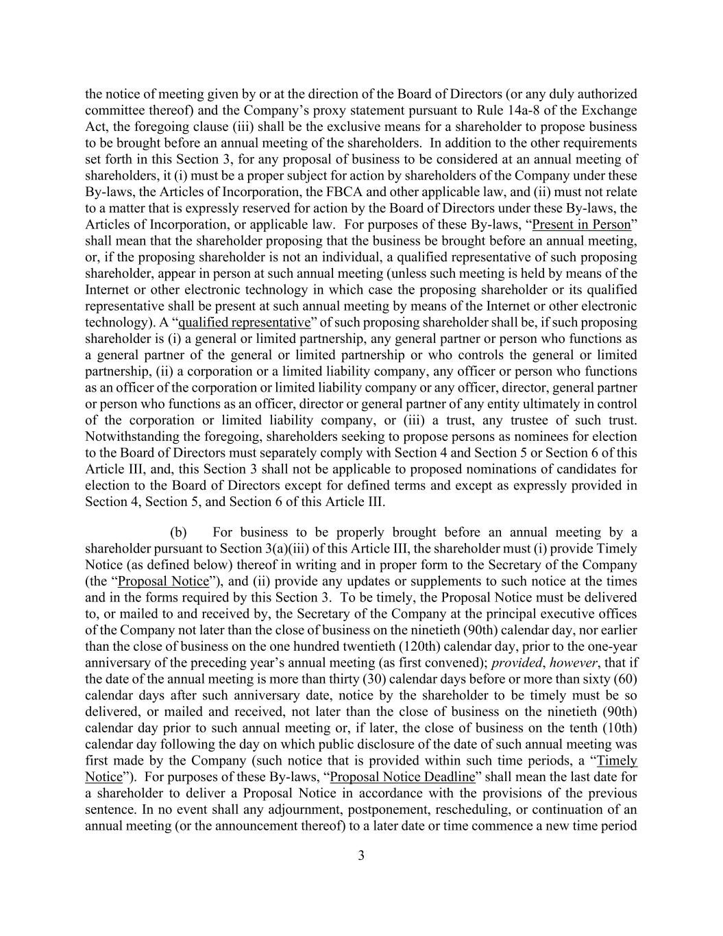 3 the notice of meeting given by or at the direction of the Board of Directors (or any duly authorized committee thereof) and the Company’s proxy statement pursuant to Rule 14a-8 of the Exchange Act, the foregoing clause (iii) shall be the exclusive means for a shareholder to propose business to be brought before an annual meeting of the shareholders. In addition to the other requirements set forth in this Section 3, for any proposal of business to be considered at an annual meeting of shareholders, it (i) must be a proper subject for action by shareholders of the Company under these By-laws, the Articles of Incorporation, the FBCA and other applicable law, and (ii) must not relate to a matter that is expressly reserved for action by the Board of Directors under these By-laws, the Articles of Incorporation, or applicable law. For purposes of these By-laws, “Present in Person” shall mean that the shareholder proposing that the business be brought before an annual meeting, or, if the proposing shareholder is not an individual, a qualified representative of such proposing shareholder, appear in person at such annual meeting (unless such meeting is held by means of the Internet or other electronic technology in which case the proposing shareholder or its qualified representative shall be present at such annual meeting by means of the Internet or other electronic technology). A “qualified representative” of such proposing shareholder shall be, if such proposing shareholder is (i) a general or limited partnership, any general partner or person who functions as a general partner of the general or limited partnership or who controls the general or limited partnership, (ii) a corporation or a limited liability company, any officer or person who functions as an officer of the corporation or limited liability company or any officer, director, general partner or person who functions as an officer, director or general partner of any entity ultimately in control of the corporation or limited liability company, or (iii) a trust, any trustee of such trust. Notwithstanding the foregoing, shareholders seeking to propose persons as nominees for election to the Board of Directors must separately comply with Section 4 and Section 5 or Section 6 of this Article III, and, this Section 3 shall not be applicable to proposed nominations of candidates for election to the Board of Directors except for defined terms and except as expressly provided in Section 4, Section 5, and Section 6 of this Article III. For business to be properly brought before an annual meeting by a shareholder pursuant to Section 3(a)(iii) of this Article III, the shareholder must (i) provide Timely Notice (as defined below) thereof in writing and in proper form to the Secretary of the Company (the “Proposal Notice”), and (ii) provide any updates or supplements to such notice at the times and in the forms required by this Section 3. To be timely, the Proposal Notice must be delivered to, or mailed to and received by, the Secretary of the Company at the principal executive offices of the Company not later than the close of business on the ninetieth (90th) calendar day, nor earlier than the close of business on the one hundred twentieth (120th) calendar day, prior to the one-year anniversary of the preceding year’s annual meeting (as first convened); provided, however, that if the date of the annual meeting is more than thirty (30) calendar days before or more than sixty (60) calendar days after such anniversary date, notice by the shareholder to be timely must be so delivered, or mailed and received, not later than the close of business on the ninetieth (90th) calendar day prior to such annual meeting or, if later, the close of business on the tenth (10th) calendar day following the day on which public disclosure of the date of such annual meeting was first made by the Company (such notice that is provided within such time periods, a “Timely Notice”). For purposes of these By-laws, “Proposal Notice Deadline” shall mean the last date for a shareholder to deliver a Proposal Notice in accordance with the provisions of the previous sentence. In no event shall any adjournment, postponement, rescheduling, or continuation of an annual meeting (or the announcement thereof) to a later date or time commence a new time period