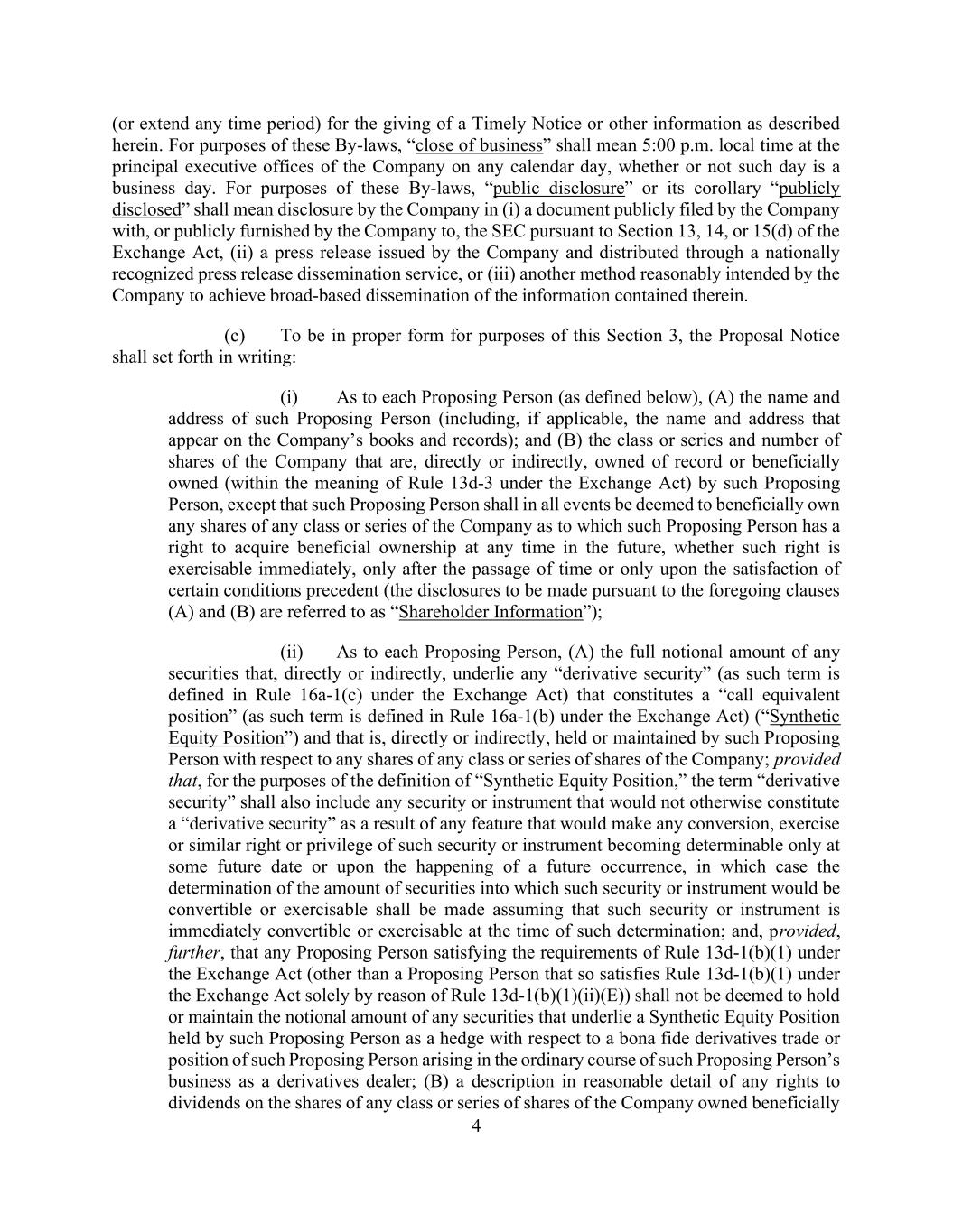 4 (or extend any time period) for the giving of a Timely Notice or other information as described herein. For purposes of these By-laws, “close of business” shall mean 5:00 p.m. local time at the principal executive offices of the Company on any calendar day, whether or not such day is a business day. For purposes of these By-laws, “public disclosure” or its corollary “publicly disclosed” shall mean disclosure by the Company in (i) a document publicly filed by the Company with, or publicly furnished by the Company to, the SEC pursuant to Section 13, 14, or 15(d) of the Exchange Act, (ii) a press release issued by the Company and distributed through a nationally recognized press release dissemination service, or (iii) another method reasonably intended by the Company to achieve broad-based dissemination of the information contained therein. To be in proper form for purposes of this Section 3, the Proposal Notice shall set forth in writing: (i) As to each Proposing Person (as defined below), (A) the name and address of such Proposing Person (including, if applicable, the name and address that appear on the Company’s books and records); and (B) the class or series and number of shares of the Company that are, directly or indirectly, owned of record or beneficially owned (within the meaning of Rule 13d-3 under the Exchange Act) by such Proposing Person, except that such Proposing Person shall in all events be deemed to beneficially own any shares of any class or series of the Company as to which such Proposing Person has a right to acquire beneficial ownership at any time in the future, whether such right is exercisable immediately, only after the passage of time or only upon the satisfaction of certain conditions precedent (the disclosures to be made pursuant to the foregoing clauses (A) and (B) are referred to as “Shareholder Information”); (ii) As to each Proposing Person, (A) the full notional amount of any securities that, directly or indirectly, underlie any “derivative security” (as such term is defined in Rule 16a-1(c) under the Exchange Act) that constitutes a “call equivalent position” (as such term is defined in Rule 16a-1(b) under the Exchange Act) (“Synthetic Equity Position”) and that is, directly or indirectly, held or maintained by such Proposing Person with respect to any shares of any class or series of shares of the Company; provided that, for the purposes of the definition of “Synthetic Equity Position,” the term “derivative security” shall also include any security or instrument that would not otherwise constitute a “derivative security” as a result of any feature that would make any conversion, exercise or similar right or privilege of such security or instrument becoming determinable only at some future date or upon the happening of a future occurrence, in which case the determination of the amount of securities into which such security or instrument would be convertible or exercisable shall be made assuming that such security or instrument is immediately convertible or exercisable at the time of such determination; and, provided, further, that any Proposing Person satisfying the requirements of Rule 13d-1(b)(1) under the Exchange Act (other than a Proposing Person that so satisfies Rule 13d-1(b)(1) under the Exchange Act solely by reason of Rule 13d-1(b)(1)(ii)(E)) shall not be deemed to hold or maintain the notional amount of any securities that underlie a Synthetic Equity Position held by such Proposing Person as a hedge with respect to a bona fide derivatives trade or position of such Proposing Person arising in the ordinary course of such Proposing Person’s business as a derivatives dealer; (B) a description in reasonable detail of any rights to dividends on the shares of any class or series of shares of the Company owned beneficially