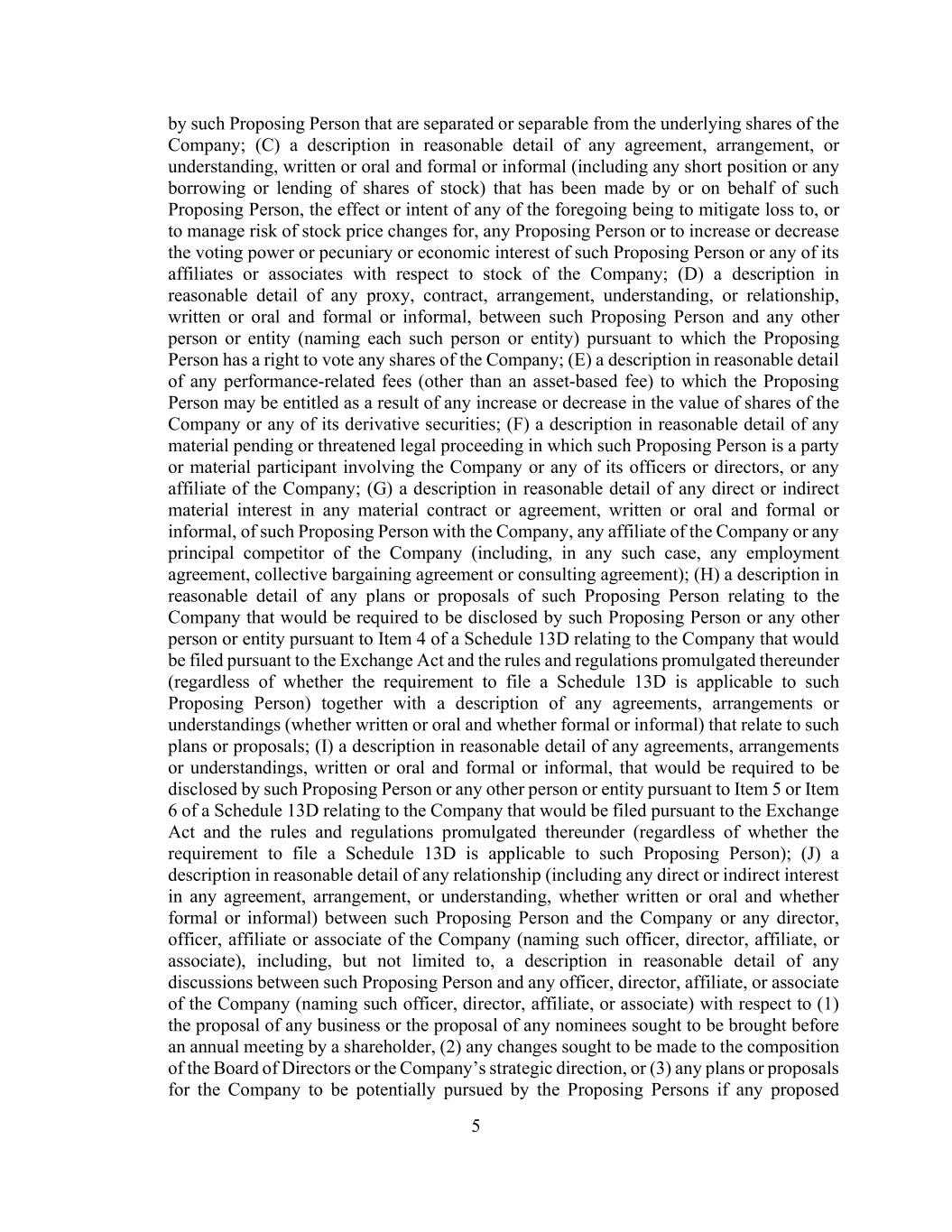 5 by such Proposing Person that are separated or separable from the underlying shares of the Company; (C) a description in reasonable detail of any agreement, arrangement, or understanding, written or oral and formal or informal (including any short position or any borrowing or lending of shares of stock) that has been made by or on behalf of such Proposing Person, the effect or intent of any of the foregoing being to mitigate loss to, or to manage risk of stock price changes for, any Proposing Person or to increase or decrease the voting power or pecuniary or economic interest of such Proposing Person or any of its affiliates or associates with respect to stock of the Company; (D) a description in reasonable detail of any proxy, contract, arrangement, understanding, or relationship, written or oral and formal or informal, between such Proposing Person and any other person or entity (naming each such person or entity) pursuant to which the Proposing Person has a right to vote any shares of the Company; (E) a description in reasonable detail of any performance-related fees (other than an asset-based fee) to which the Proposing Person may be entitled as a result of any increase or decrease in the value of shares of the Company or any of its derivative securities; (F) a description in reasonable detail of any material pending or threatened legal proceeding in which such Proposing Person is a party or material participant involving the Company or any of its officers or directors, or any affiliate of the Company; (G) a description in reasonable detail of any direct or indirect material interest in any material contract or agreement, written or oral and formal or informal, of such Proposing Person with the Company, any affiliate of the Company or any principal competitor of the Company (including, in any such case, any employment agreement, collective bargaining agreement or consulting agreement); (H) a description in reasonable detail of any plans or proposals of such Proposing Person relating to the Company that would be required to be disclosed by such Proposing Person or any other person or entity pursuant to Item 4 of a Schedule 13D relating to the Company that would be filed pursuant to the Exchange Act and the rules and regulations promulgated thereunder (regardless of whether the requirement to file a Schedule 13D is applicable to such Proposing Person) together with a description of any agreements, arrangements or understandings (whether written or oral and whether formal or informal) that relate to such plans or proposals; (I) a description in reasonable detail of any agreements, arrangements or understandings, written or oral and formal or informal, that would be required to be disclosed by such Proposing Person or any other person or entity pursuant to Item 5 or Item 6 of a Schedule 13D relating to the Company that would be filed pursuant to the Exchange Act and the rules and regulations promulgated thereunder (regardless of whether the requirement to file a Schedule 13D is applicable to such Proposing Person); (J) a description in reasonable detail of any relationship (including any direct or indirect interest in any agreement, arrangement, or understanding, whether written or oral and whether formal or informal) between such Proposing Person and the Company or any director, officer, affiliate or associate of the Company (naming such officer, director, affiliate, or associate), including, but not limited to, a description in reasonable detail of any discussions between such Proposing Person and any officer, director, affiliate, or associate of the Company (naming such officer, director, affiliate, or associate) with respect to (1) the proposal of any business or the proposal of any nominees sought to be brought before an annual meeting by a shareholder, (2) any changes sought to be made to the composition of the Board of Directors or the Company’s strategic direction, or (3) any plans or proposals for the Company to be potentially pursued by the Proposing Persons if any proposed