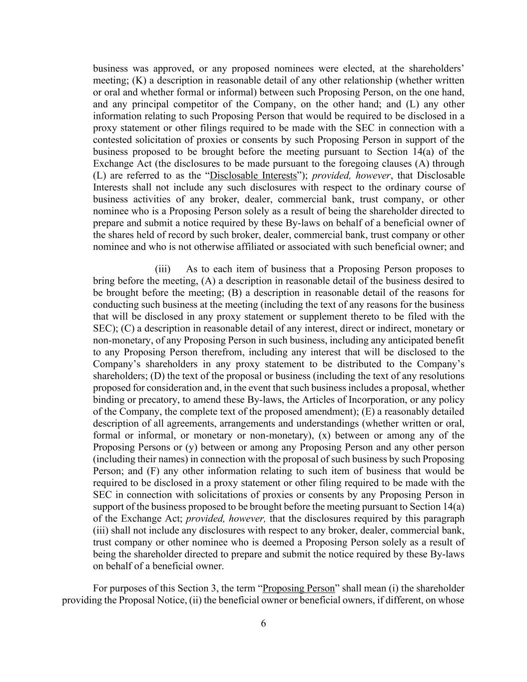 6 business was approved, or any proposed nominees were elected, at the shareholders’ meeting; (K) a description in reasonable detail of any other relationship (whether written or oral and whether formal or informal) between such Proposing Person, on the one hand, and any principal competitor of the Company, on the other hand; and (L) any other information relating to such Proposing Person that would be required to be disclosed in a proxy statement or other filings required to be made with the SEC in connection with a contested solicitation of proxies or consents by such Proposing Person in support of the business proposed to be brought before the meeting pursuant to Section 14(a) of the Exchange Act (the disclosures to be made pursuant to the foregoing clauses (A) through (L) are referred to as the “Disclosable Interests”); provided, however, that Disclosable Interests shall not include any such disclosures with respect to the ordinary course of business activities of any broker, dealer, commercial bank, trust company, or other nominee who is a Proposing Person solely as a result of being the shareholder directed to prepare and submit a notice required by these By-laws on behalf of a beneficial owner of the shares held of record by such broker, dealer, commercial bank, trust company or other nominee and who is not otherwise affiliated or associated with such beneficial owner; and (iii) As to each item of business that a Proposing Person proposes to bring before the meeting, (A) a description in reasonable detail of the business desired to be brought before the meeting; (B) a description in reasonable detail of the reasons for conducting such business at the meeting (including the text of any reasons for the business that will be disclosed in any proxy statement or supplement thereto to be filed with the SEC); (C) a description in reasonable detail of any interest, direct or indirect, monetary or non-monetary, of any Proposing Person in such business, including any anticipated benefit to any Proposing Person therefrom, including any interest that will be disclosed to the Company’s shareholders in any proxy statement to be distributed to the Company’s shareholders; (D) the text of the proposal or business (including the text of any resolutions proposed for consideration and, in the event that such business includes a proposal, whether binding or precatory, to amend these By-laws, the Articles of Incorporation, or any policy of the Company, the complete text of the proposed amendment); (E) a reasonably detailed description of all agreements, arrangements and understandings (whether written or oral, formal or informal, or monetary or non-monetary), (x) between or among any of the Proposing Persons or (y) between or among any Proposing Person and any other person (including their names) in connection with the proposal of such business by such Proposing Person; and (F) any other information relating to such item of business that would be required to be disclosed in a proxy statement or other filing required to be made with the SEC in connection with solicitations of proxies or consents by any Proposing Person in support of the business proposed to be brought before the meeting pursuant to Section 14(a) of the Exchange Act; provided, however, that the disclosures required by this paragraph (iii) shall not include any disclosures with respect to any broker, dealer, commercial bank, trust company or other nominee who is deemed a Proposing Person solely as a result of being the shareholder directed to prepare and submit the notice required by these By-laws on behalf of a beneficial owner. For purposes of this Section 3, the term “Proposing Person” shall mean (i) the shareholder providing the Proposal Notice, (ii) the beneficial owner or beneficial owners, if different, on whose