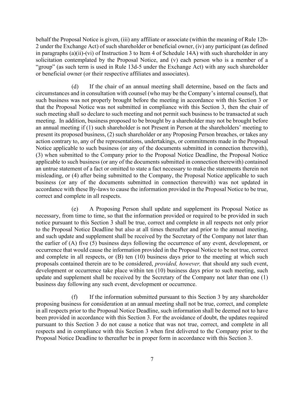7 behalf the Proposal Notice is given, (iii) any affiliate or associate (within the meaning of Rule 12b- 2 under the Exchange Act) of such shareholder or beneficial owner, (iv) any participant (as defined in paragraphs (a)(ii)-(vi) of Instruction 3 to Item 4 of Schedule 14A) with such shareholder in any solicitation contemplated by the Proposal Notice, and (v) each person who is a member of a “group” (as such term is used in Rule 13d-5 under the Exchange Act) with any such shareholder or beneficial owner (or their respective affiliates and associates). If the chair of an annual meeting shall determine, based on the facts and circumstances and in consultation with counsel (who may be the Company’s internal counsel), that such business was not properly brought before the meeting in accordance with this Section 3 or that the Proposal Notice was not submitted in compliance with this Section 3, then the chair of such meeting shall so declare to such meeting and not permit such business to be transacted at such meeting. In addition, business proposed to be brought by a shareholder may not be brought before an annual meeting if (1) such shareholder is not Present in Person at the shareholders’ meeting to present its proposed business, (2) such shareholder or any Proposing Person breaches, or takes any action contrary to, any of the representations, undertakings, or commitments made in the Proposal Notice applicable to such business (or any of the documents submitted in connection therewith), (3) when submitted to the Company prior to the Proposal Notice Deadline, the Proposal Notice applicable to such business (or any of the documents submitted in connection therewith) contained an untrue statement of a fact or omitted to state a fact necessary to make the statements therein not misleading, or (4) after being submitted to the Company, the Proposal Notice applicable to such business (or any of the documents submitted in connection therewith) was not updated in accordance with these By-laws to cause the information provided in the Proposal Notice to be true, correct and complete in all respects. A Proposing Person shall update and supplement its Proposal Notice as necessary, from time to time, so that the information provided or required to be provided in such notice pursuant to this Section 3 shall be true, correct and complete in all respects not only prior to the Proposal Notice Deadline but also at all times thereafter and prior to the annual meeting, and such update and supplement shall be received by the Secretary of the Company not later than the earlier of (A) five (5) business days following the occurrence of any event, development, or occurrence that would cause the information provided in the Proposal Notice to be not true, correct and complete in all respects, or (B) ten (10) business days prior to the meeting at which such proposals contained therein are to be considered, provided, however, that should any such event, development or occurrence take place within ten (10) business days prior to such meeting, such update and supplement shall be received by the Secretary of the Company not later than one (1) business day following any such event, development or occurrence. If the information submitted pursuant to this Section 3 by any shareholder proposing business for consideration at an annual meeting shall not be true, correct, and complete in all respects prior to the Proposal Notice Deadline, such information shall be deemed not to have been provided in accordance with this Section 3. For the avoidance of doubt, the updates required pursuant to this Section 3 do not cause a notice that was not true, correct, and complete in all respects and in compliance with this Section 3 when first delivered to the Company prior to the Proposal Notice Deadline to thereafter be in proper form in accordance with this Section 3.