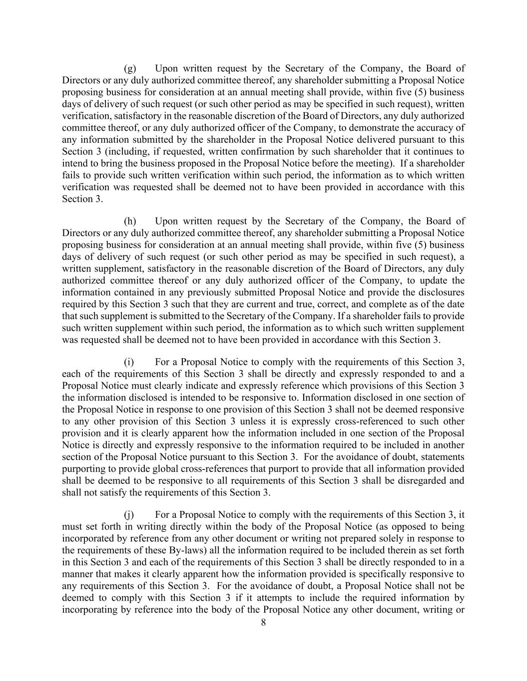 8 Upon written request by the Secretary of the Company, the Board of Directors or any duly authorized committee thereof, any shareholder submitting a Proposal Notice proposing business for consideration at an annual meeting shall provide, within five (5) business days of delivery of such request (or such other period as may be specified in such request), written verification, satisfactory in the reasonable discretion of the Board of Directors, any duly authorized committee thereof, or any duly authorized officer of the Company, to demonstrate the accuracy of any information submitted by the shareholder in the Proposal Notice delivered pursuant to this Section 3 (including, if requested, written confirmation by such shareholder that it continues to intend to bring the business proposed in the Proposal Notice before the meeting). If a shareholder fails to provide such written verification within such period, the information as to which written verification was requested shall be deemed not to have been provided in accordance with this Section 3. Upon written request by the Secretary of the Company, the Board of Directors or any duly authorized committee thereof, any shareholder submitting a Proposal Notice proposing business for consideration at an annual meeting shall provide, within five (5) business days of delivery of such request (or such other period as may be specified in such request), a written supplement, satisfactory in the reasonable discretion of the Board of Directors, any duly authorized committee thereof or any duly authorized officer of the Company, to update the information contained in any previously submitted Proposal Notice and provide the disclosures required by this Section 3 such that they are current and true, correct, and complete as of the date that such supplement is submitted to the Secretary of the Company. If a shareholder fails to provide such written supplement within such period, the information as to which such written supplement was requested shall be deemed not to have been provided in accordance with this Section 3. For a Proposal Notice to comply with the requirements of this Section 3, each of the requirements of this Section 3 shall be directly and expressly responded to and a Proposal Notice must clearly indicate and expressly reference which provisions of this Section 3 the information disclosed is intended to be responsive to. Information disclosed in one section of the Proposal Notice in response to one provision of this Section 3 shall not be deemed responsive to any other provision of this Section 3 unless it is expressly cross-referenced to such other provision and it is clearly apparent how the information included in one section of the Proposal Notice is directly and expressly responsive to the information required to be included in another section of the Proposal Notice pursuant to this Section 3. For the avoidance of doubt, statements purporting to provide global cross-references that purport to provide that all information provided shall be deemed to be responsive to all requirements of this Section 3 shall be disregarded and shall not satisfy the requirements of this Section 3. For a Proposal Notice to comply with the requirements of this Section 3, it must set forth in writing directly within the body of the Proposal Notice (as opposed to being incorporated by reference from any other document or writing not prepared solely in response to the requirements of these By-laws) all the information required to be included therein as set forth in this Section 3 and each of the requirements of this Section 3 shall be directly responded to in a manner that makes it clearly apparent how the information provided is specifically responsive to any requirements of this Section 3. For the avoidance of doubt, a Proposal Notice shall not be deemed to comply with this Section 3 if it attempts to include the required information by incorporating by reference into the body of the Proposal Notice any other document, writing or