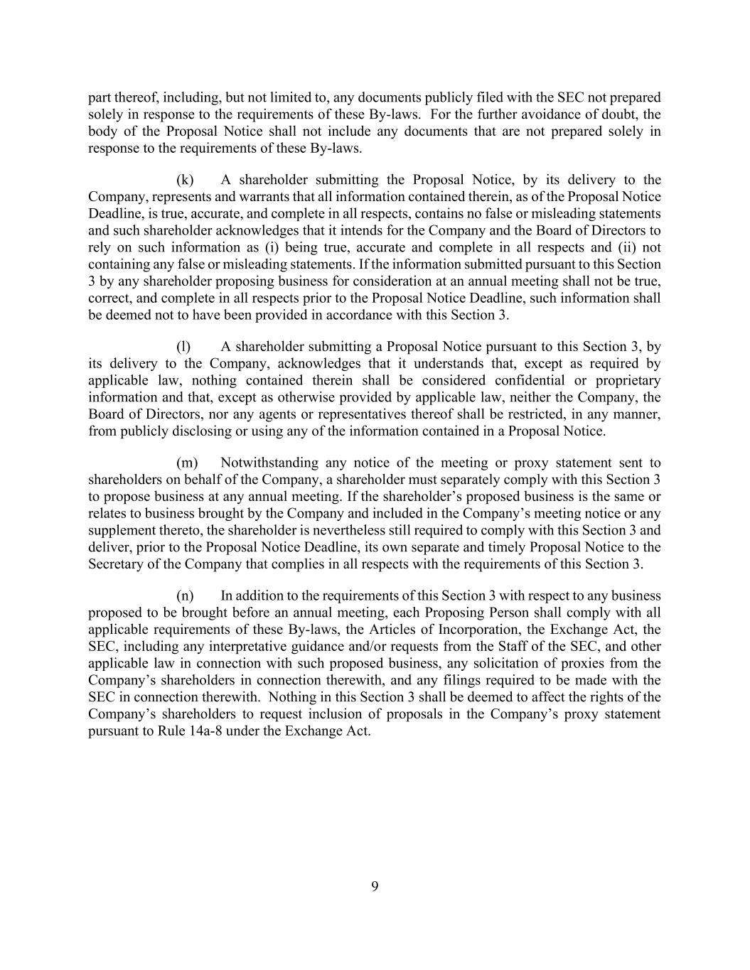 9 part thereof, including, but not limited to, any documents publicly filed with the SEC not prepared solely in response to the requirements of these By-laws. For the further avoidance of doubt, the body of the Proposal Notice shall not include any documents that are not prepared solely in response to the requirements of these By-laws. A shareholder submitting the Proposal Notice, by its delivery to the Company, represents and warrants that all information contained therein, as of the Proposal Notice Deadline, is true, accurate, and complete in all respects, contains no false or misleading statements and such shareholder acknowledges that it intends for the Company and the Board of Directors to rely on such information as (i) being true, accurate and complete in all respects and (ii) not containing any false or misleading statements. If the information submitted pursuant to this Section 3 by any shareholder proposing business for consideration at an annual meeting shall not be true, correct, and complete in all respects prior to the Proposal Notice Deadline, such information shall be deemed not to have been provided in accordance with this Section 3. A shareholder submitting a Proposal Notice pursuant to this Section 3, by its delivery to the Company, acknowledges that it understands that, except as required by applicable law, nothing contained therein shall be considered confidential or proprietary information and that, except as otherwise provided by applicable law, neither the Company, the Board of Directors, nor any agents or representatives thereof shall be restricted, in any manner, from publicly disclosing or using any of the information contained in a Proposal Notice. Notwithstanding any notice of the meeting or proxy statement sent to shareholders on behalf of the Company, a shareholder must separately comply with this Section 3 to propose business at any annual meeting. If the shareholder’s proposed business is the same or relates to business brought by the Company and included in the Company’s meeting notice or any supplement thereto, the shareholder is nevertheless still required to comply with this Section 3 and deliver, prior to the Proposal Notice Deadline, its own separate and timely Proposal Notice to the Secretary of the Company that complies in all respects with the requirements of this Section 3. In addition to the requirements of this Section 3 with respect to any business proposed to be brought before an annual meeting, each Proposing Person shall comply with all applicable requirements of these By-laws, the Articles of Incorporation, the Exchange Act, the SEC, including any interpretative guidance and/or requests from the Staff of the SEC, and other applicable law in connection with such proposed business, any solicitation of proxies from the Company’s shareholders in connection therewith, and any filings required to be made with the SEC in connection therewith. Nothing in this Section 3 shall be deemed to affect the rights of the Company’s shareholders to request inclusion of proposals in the Company’s proxy statement pursuant to Rule 14a-8 under the Exchange Act.