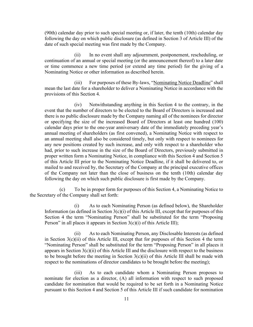 11 (90th) calendar day prior to such special meeting or, if later, the tenth (10th) calendar day following the day on which public disclosure (as defined in Section 3 of Article III) of the date of such special meeting was first made by the Company. (ii) In no event shall any adjournment, postponement, rescheduling, or continuation of an annual or special meeting (or the announcement thereof) to a later date or time commence a new time period (or extend any time period) for the giving of a Nominating Notice or other information as described herein. (iii) For purposes of these By-laws, “Nominating Notice Deadline” shall mean the last date for a shareholder to deliver a Nominating Notice in accordance with the provisions of this Section 4. (iv) Notwithstanding anything in this Section 4 to the contrary, in the event that the number of directors to be elected to the Board of Directors is increased and there is no public disclosure made by the Company naming all of the nominees for director or specifying the size of the increased Board of Directors at least one hundred (100) calendar days prior to the one-year anniversary date of the immediately preceding year’s annual meeting of shareholders (as first convened), a Nominating Notice with respect to an annual meeting shall also be considered timely, but only with respect to nominees for any new positions created by such increase, and only with respect to a shareholder who had, prior to such increase in the size of the Board of Directors, previously submitted in proper written form a Nominating Notice, in compliance with this Section 4 and Section 5 of this Article III prior to the Nominating Notice Deadline, if it shall be delivered to, or mailed to and received by, the Secretary of the Company at the principal executive offices of the Company not later than the close of business on the tenth (10th) calendar day following the day on which such public disclosure is first made by the Company. To be in proper form for purposes of this Section 4, a Nominating Notice to the Secretary of the Company shall set forth: (i) As to each Nominating Person (as defined below), the Shareholder Information (as defined in Section 3(c)(i) of this Article III, except that for purposes of this Section 4 the term “Nominating Person” shall be substituted for the term “Proposing Person” in all places it appears in Section 3(c)(i) of this Article III); (ii) As to each Nominating Person, any Disclosable Interests (as defined in Section 3(c)(ii) of this Article III, except that for purposes of this Section 4 the term “Nominating Person” shall be substituted for the term “Proposing Person” in all places it appears in Section 3(c)(ii) of this Article III and the disclosure with respect to the business to be brought before the meeting in Section 3(c)(ii) of this Article III shall be made with respect to the nominations of director candidates to be brought before the meeting); (iii) As to each candidate whom a Nominating Person proposes to nominate for election as a director, (A) all information with respect to such proposed candidate for nomination that would be required to be set forth in a Nominating Notice pursuant to this Section 4 and Section 5 of this Article III if such candidate for nomination