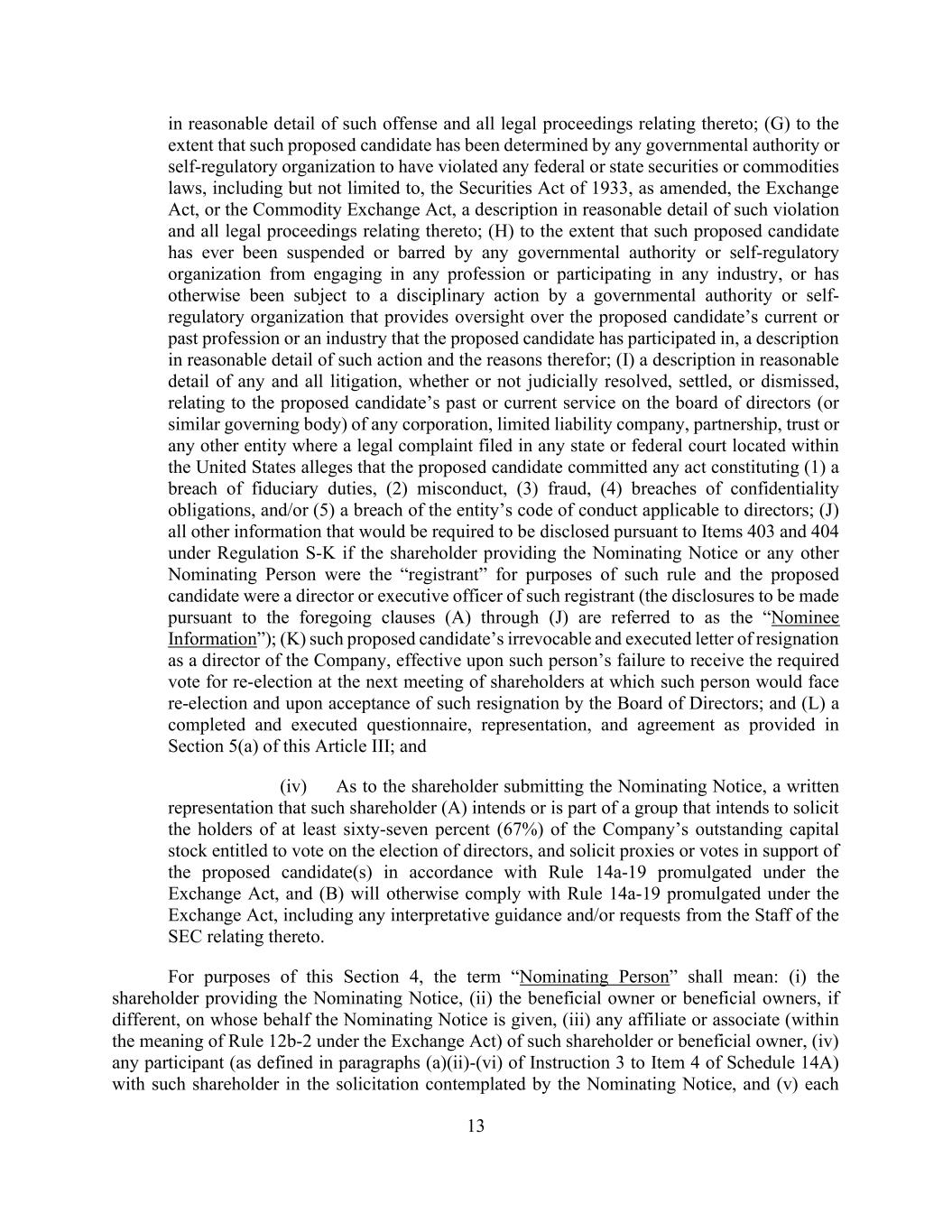 13 in reasonable detail of such offense and all legal proceedings relating thereto; (G) to the extent that such proposed candidate has been determined by any governmental authority or self-regulatory organization to have violated any federal or state securities or commodities laws, including but not limited to, the Securities Act of 1933, as amended, the Exchange Act, or the Commodity Exchange Act, a description in reasonable detail of such violation and all legal proceedings relating thereto; (H) to the extent that such proposed candidate has ever been suspended or barred by any governmental authority or self-regulatory organization from engaging in any profession or participating in any industry, or has otherwise been subject to a disciplinary action by a governmental authority or self- regulatory organization that provides oversight over the proposed candidate’s current or past profession or an industry that the proposed candidate has participated in, a description in reasonable detail of such action and the reasons therefor; (I) a description in reasonable detail of any and all litigation, whether or not judicially resolved, settled, or dismissed, relating to the proposed candidate’s past or current service on the board of directors (or similar governing body) of any corporation, limited liability company, partnership, trust or any other entity where a legal complaint filed in any state or federal court located within the United States alleges that the proposed candidate committed any act constituting (1) a breach of fiduciary duties, (2) misconduct, (3) fraud, (4) breaches of confidentiality obligations, and/or (5) a breach of the entity’s code of conduct applicable to directors; (J) all other information that would be required to be disclosed pursuant to Items 403 and 404 under Regulation S-K if the shareholder providing the Nominating Notice or any other Nominating Person were the “registrant” for purposes of such rule and the proposed candidate were a director or executive officer of such registrant (the disclosures to be made pursuant to the foregoing clauses (A) through (J) are referred to as the “Nominee Information”); (K) such proposed candidate’s irrevocable and executed letter of resignation as a director of the Company, effective upon such person’s failure to receive the required vote for re-election at the next meeting of shareholders at which such person would face re-election and upon acceptance of such resignation by the Board of Directors; and (L) a completed and executed questionnaire, representation, and agreement as provided in Section 5(a) of this Article III; and (iv) As to the shareholder submitting the Nominating Notice, a written representation that such shareholder (A) intends or is part of a group that intends to solicit the holders of at least sixty-seven percent (67%) of the Company’s outstanding capital stock entitled to vote on the election of directors, and solicit proxies or votes in support of the proposed candidate(s) in accordance with Rule 14a-19 promulgated under the Exchange Act, and (B) will otherwise comply with Rule 14a-19 promulgated under the Exchange Act, including any interpretative guidance and/or requests from the Staff of the SEC relating thereto. For purposes of this Section 4, the term “Nominating Person” shall mean: (i) the shareholder providing the Nominating Notice, (ii) the beneficial owner or beneficial owners, if different, on whose behalf the Nominating Notice is given, (iii) any affiliate or associate (within the meaning of Rule 12b-2 under the Exchange Act) of such shareholder or beneficial owner, (iv) any participant (as defined in paragraphs (a)(ii)-(vi) of Instruction 3 to Item 4 of Schedule 14A) with such shareholder in the solicitation contemplated by the Nominating Notice, and (v) each
