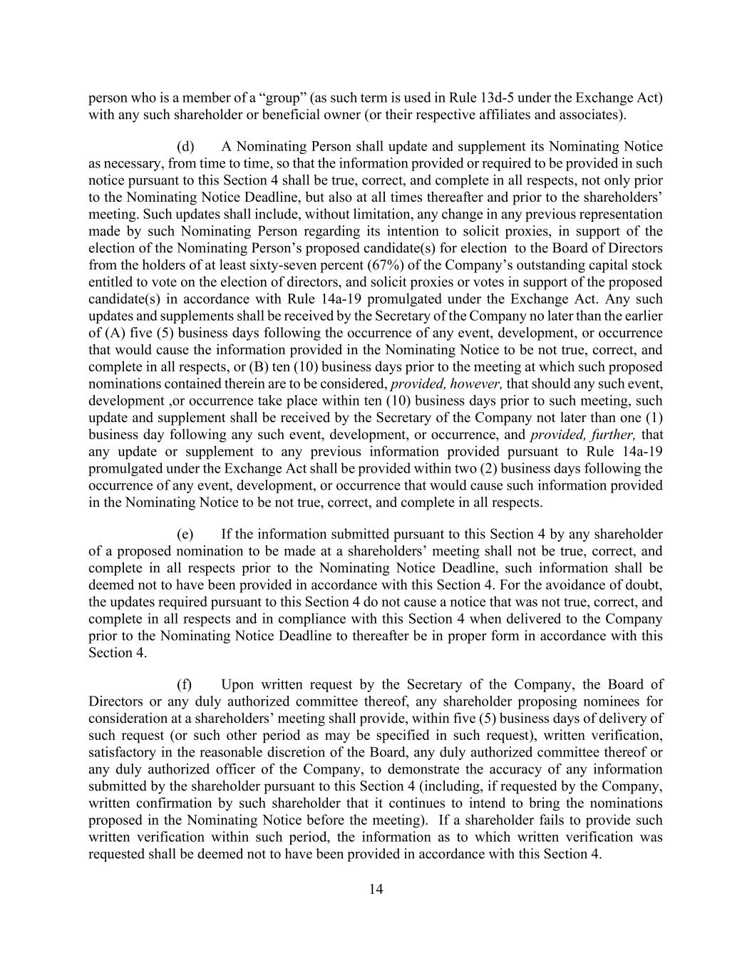 14 person who is a member of a “group” (as such term is used in Rule 13d-5 under the Exchange Act) with any such shareholder or beneficial owner (or their respective affiliates and associates). A Nominating Person shall update and supplement its Nominating Notice as necessary, from time to time, so that the information provided or required to be provided in such notice pursuant to this Section 4 shall be true, correct, and complete in all respects, not only prior to the Nominating Notice Deadline, but also at all times thereafter and prior to the shareholders’ meeting. Such updates shall include, without limitation, any change in any previous representation made by such Nominating Person regarding its intention to solicit proxies, in support of the election of the Nominating Person’s proposed candidate(s) for election to the Board of Directors from the holders of at least sixty-seven percent (67%) of the Company’s outstanding capital stock entitled to vote on the election of directors, and solicit proxies or votes in support of the proposed candidate(s) in accordance with Rule 14a-19 promulgated under the Exchange Act. Any such updates and supplements shall be received by the Secretary of the Company no later than the earlier of (A) five (5) business days following the occurrence of any event, development, or occurrence that would cause the information provided in the Nominating Notice to be not true, correct, and complete in all respects, or (B) ten (10) business days prior to the meeting at which such proposed nominations contained therein are to be considered, provided, however, that should any such event, development ,or occurrence take place within ten (10) business days prior to such meeting, such update and supplement shall be received by the Secretary of the Company not later than one (1) business day following any such event, development, or occurrence, and provided, further, that any update or supplement to any previous information provided pursuant to Rule 14a-19 promulgated under the Exchange Act shall be provided within two (2) business days following the occurrence of any event, development, or occurrence that would cause such information provided in the Nominating Notice to be not true, correct, and complete in all respects. If the information submitted pursuant to this Section 4 by any shareholder of a proposed nomination to be made at a shareholders’ meeting shall not be true, correct, and complete in all respects prior to the Nominating Notice Deadline, such information shall be deemed not to have been provided in accordance with this Section 4. For the avoidance of doubt, the updates required pursuant to this Section 4 do not cause a notice that was not true, correct, and complete in all respects and in compliance with this Section 4 when delivered to the Company prior to the Nominating Notice Deadline to thereafter be in proper form in accordance with this Section 4. Upon written request by the Secretary of the Company, the Board of Directors or any duly authorized committee thereof, any shareholder proposing nominees for consideration at a shareholders’ meeting shall provide, within five (5) business days of delivery of such request (or such other period as may be specified in such request), written verification, satisfactory in the reasonable discretion of the Board, any duly authorized committee thereof or any duly authorized officer of the Company, to demonstrate the accuracy of any information submitted by the shareholder pursuant to this Section 4 (including, if requested by the Company, written confirmation by such shareholder that it continues to intend to bring the nominations proposed in the Nominating Notice before the meeting). If a shareholder fails to provide such written verification within such period, the information as to which written verification was requested shall be deemed not to have been provided in accordance with this Section 4.