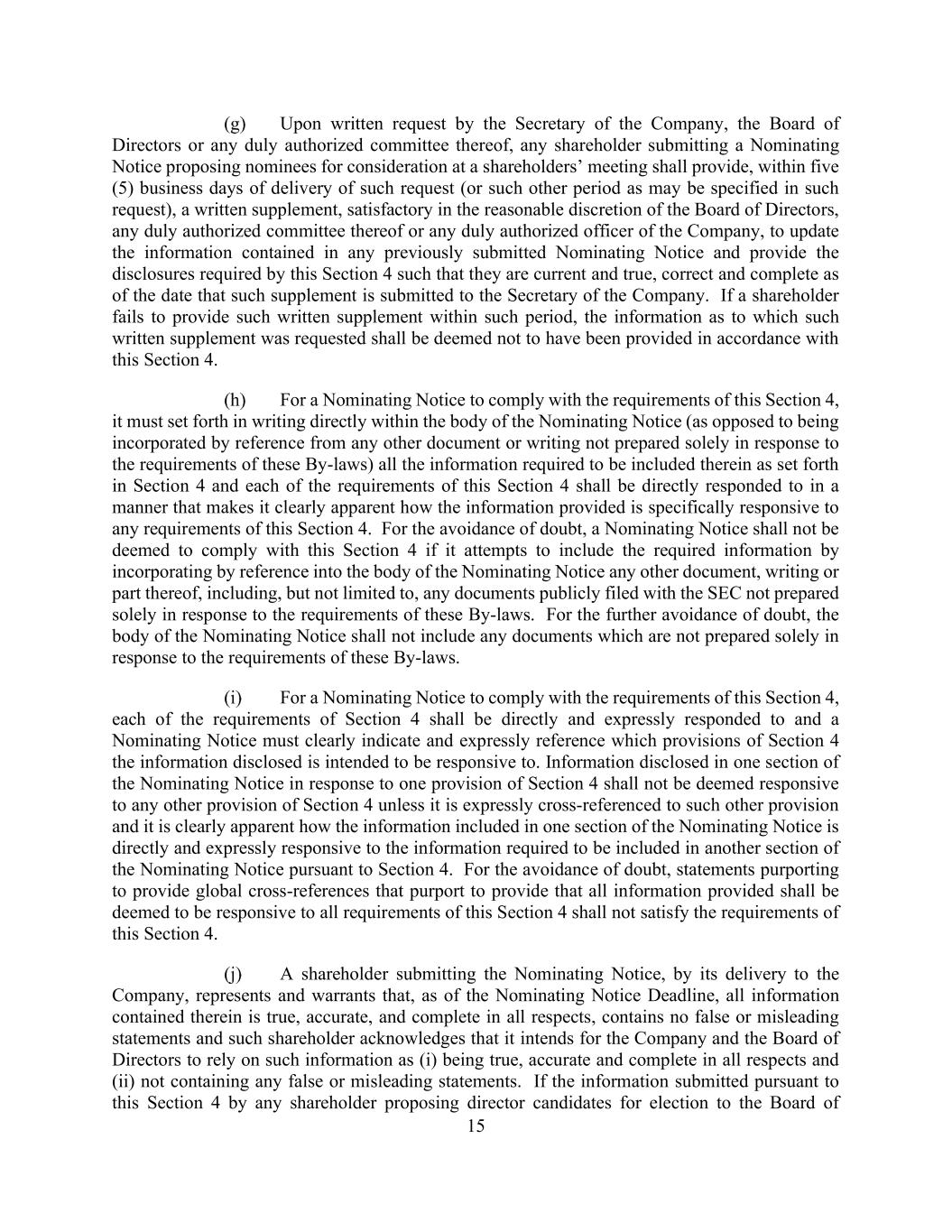 15 Upon written request by the Secretary of the Company, the Board of Directors or any duly authorized committee thereof, any shareholder submitting a Nominating Notice proposing nominees for consideration at a shareholders’ meeting shall provide, within five (5) business days of delivery of such request (or such other period as may be specified in such request), a written supplement, satisfactory in the reasonable discretion of the Board of Directors, any duly authorized committee thereof or any duly authorized officer of the Company, to update the information contained in any previously submitted Nominating Notice and provide the disclosures required by this Section 4 such that they are current and true, correct and complete as of the date that such supplement is submitted to the Secretary of the Company. If a shareholder fails to provide such written supplement within such period, the information as to which such written supplement was requested shall be deemed not to have been provided in accordance with this Section 4. For a Nominating Notice to comply with the requirements of this Section 4, it must set forth in writing directly within the body of the Nominating Notice (as opposed to being incorporated by reference from any other document or writing not prepared solely in response to the requirements of these By-laws) all the information required to be included therein as set forth in Section 4 and each of the requirements of this Section 4 shall be directly responded to in a manner that makes it clearly apparent how the information provided is specifically responsive to any requirements of this Section 4. For the avoidance of doubt, a Nominating Notice shall not be deemed to comply with this Section 4 if it attempts to include the required information by incorporating by reference into the body of the Nominating Notice any other document, writing or part thereof, including, but not limited to, any documents publicly filed with the SEC not prepared solely in response to the requirements of these By-laws. For the further avoidance of doubt, the body of the Nominating Notice shall not include any documents which are not prepared solely in response to the requirements of these By-laws. For a Nominating Notice to comply with the requirements of this Section 4, each of the requirements of Section 4 shall be directly and expressly responded to and a Nominating Notice must clearly indicate and expressly reference which provisions of Section 4 the information disclosed is intended to be responsive to. Information disclosed in one section of the Nominating Notice in response to one provision of Section 4 shall not be deemed responsive to any other provision of Section 4 unless it is expressly cross-referenced to such other provision and it is clearly apparent how the information included in one section of the Nominating Notice is directly and expressly responsive to the information required to be included in another section of the Nominating Notice pursuant to Section 4. For the avoidance of doubt, statements purporting to provide global cross-references that purport to provide that all information provided shall be deemed to be responsive to all requirements of this Section 4 shall not satisfy the requirements of this Section 4. A shareholder submitting the Nominating Notice, by its delivery to the Company, represents and warrants that, as of the Nominating Notice Deadline, all information contained therein is true, accurate, and complete in all respects, contains no false or misleading statements and such shareholder acknowledges that it intends for the Company and the Board of Directors to rely on such information as (i) being true, accurate and complete in all respects and (ii) not containing any false or misleading statements. If the information submitted pursuant to this Section 4 by any shareholder proposing director candidates for election to the Board of