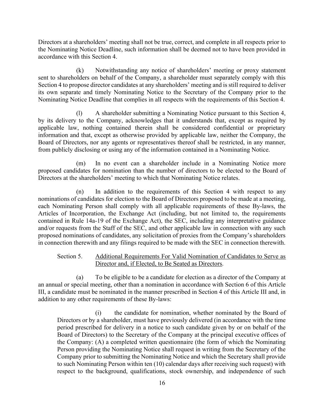 18 (iii) Notwithstanding the provisions of Section 4 of this Article III and this Section 5, unless otherwise required by law, (i) no Nominating Person shall solicit proxies in support of candidates for nomination other than the nominees by the Board of Directors unless such Nominating Person has complied with Rule 14a-19 promulgated under the Exchange Act, and (ii) if any Nominating Person providing a Nominating Notice (1) provides notice pursuant to Rule 14a-19(b) promulgated under the Exchange Act and (2) subsequently fails to comply with the requirements of Rule 14a-19(a)(2) and Rule 14a- 19(a)(3) promulgated under the Exchange Act, then the Company shall disregard any proxies or votes solicited for any candidates nominated by such Nominating Person and no vote on the election of such candidates shall occur. Upon request by the Company, in connection with a Nominating Notice submitted pursuant to the provisions of Section 4 of this Article III and this Section 5, if any Nominating Person provides notice pursuant to Rule 14a-19(b) promulgated under the Exchange Act, such Nominating Person shall deliver to the Company, no later than five (5) business days prior to the applicable meeting date or any adjournment, rescheduling, or postponement thereof, reasonable evidence that it has met the requirements of Rule 14a-19(a)(3) promulgated under the Exchange Act. The Company may also require any proposed candidate for nomination as a director to submit in writing to the Secretary of the Company, no later than five (5) business days after a request is made therefor to either the Nominating Person that submitted the Nominating Notice or such proposed candidate for nomination, such other information (1) as may reasonably be required by the Company to determine the eligibility of such proposed candidate to serve as an independent director (as determined under any applicable rules of the SEC, listing standards of any national securities exchange on which any securities of the Company are listed, and any publicly disclosed standards used by the Board of Directors in determining and disclosing the independence of its directors, including those applicable to a director’s service on any of the committees of the Board of Directors, or the requirements of any other laws or regulations applicable to the Company, or (2) that could be material to a shareholder’s understanding of the independence or lack of independence of such proposed candidate for nomination. No candidate shall be eligible for nomination as a director of the Company unless such candidate for nomination and the Nominating Person seeking to place such candidate’s name in nomination has complied with Section 4 of this Article III and this Section 5, as applicable. The presiding officer at the meeting shall, based on the facts and circumstances and in consultation with counsel (who may be the Company’s internal counsel), determine that a nomination was not properly made in accordance with Section 4 of this Article III and this Section 5, and if such presiding officer should so determine, such presiding officer shall declare such determination to the meeting, the defective nomination shall be disregarded and any ballots cast for the candidate in question (but in the case of any form of ballot listing other qualified candidates, only the ballots cast for the candidate in question) shall be void and of no force or effect. In addition, proposed nominations made by a shareholder may not be brought before a shareholders’ meeting if (1) such shareholder is not Present in Person at the shareholders’ meeting to present its proposed nominations, (2) such shareholder, any Nominating Person, or any proposed nominee breaches, or acts contrary to, any of the representations, undertakings, or commitments made in the Nominating Notice applicable to such nomination(s) (or any of the documents submitted in connection therewith), (3) the Nominating Notice applicable to such nomination(s) (or any of the documents